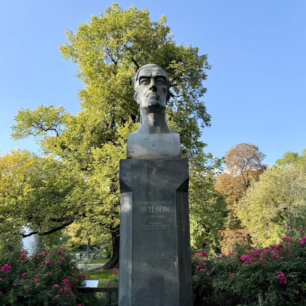 Nach dem Essen spazierte ich erstmal durch den angrenzenden Park Wilsona, der 1901, ergo noch zu Kaisers Zeiten, als 7,2 ha großer botanischer Garten mitsamt Palmenhaus eröffnet wurde. Nach dem Ersten Weltkrieg (1914 – 1918) wechselte die Stadt jedoch bekanntlich den Besitzer. Aus Posen wurde Poznań und aus dem Botanischen Garten der Ogród botaniczny. Weil die Polen wussten, wem sie dafür Dank schuldeten, benannten sie den Park allerdings 1927 nochmal um. Mit dem Namen Park Wilsona sollte Woodrow Wilson (* 1856; † 1924) posthum in Poznań geehrt werden. Denn nach dem Krieg war Wilson als damaliger Präsident der USA maßgeblich für die europäische Neuordnung und die Rückkehr Polens* auf die Weltkarte verantwortlich.
