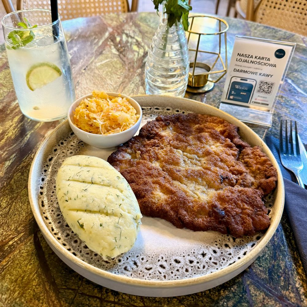 Die Wahl fiel auf das Lokal Projekt Wilson, von dessen Eingangstür mich nur fünf Fußminuten trennten. Hier wird durchgehend warme Küche serviert, so dass ich auch um 15 Uhr problemlos ein Kotlet schabowy bestellen konnte. Das panierte Schweinekotelett wurde mit Kartoffelpüree und Rohkostsalat serviert und kostete zusammen mit einer hausgemachten Limonade 73 Złoty (ca. 17 €).