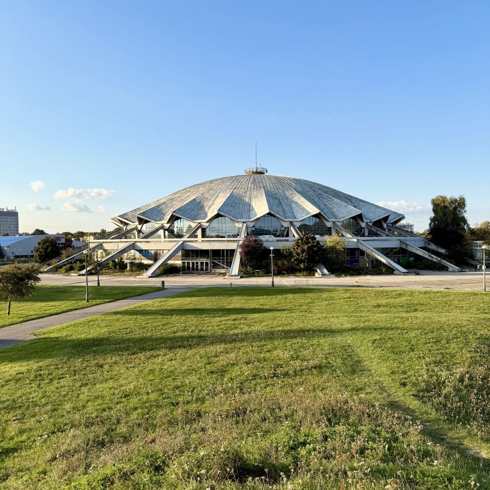 Aber es gibt auch Architektur jüngeren Datums in Łazarz. So ist im Norden des Stadtbezirks beispielsweise das im Wesentlichen in den 1920er Jahren erbaute Messegelände zu finden, auf das ich heute übrigens aus meinem Schlafzimmerfenster blicken durfte. Die hiesige Messegesellschaft Międzynarodowe Targi Poznańskie ist außerdem auch der aktuelle Betreiber der markanten Hala Arena im Park Jana Kasprowicza (Jan-Kasprowicz-Park). Jene kreisrunde Multifunktionshalle aus Stahl, Beton und Aluminium wurde 1974 eröffnet und hat sich offensichtlich den 17 Jahre älteren Palazzetto dello Sport in Roma (Rom) zum architektonischen Vorbild genommen.