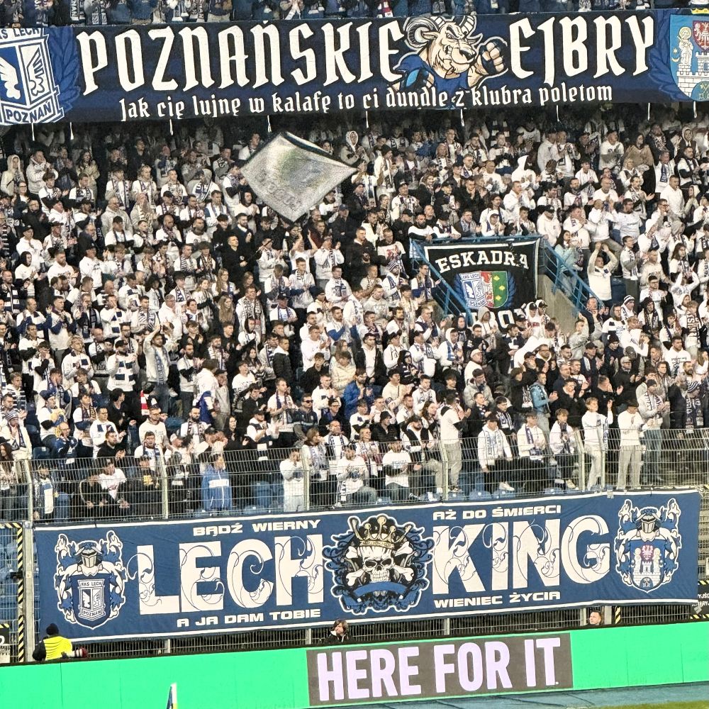 Nur sieben Minuten später sah Hedl ein zweites Mal blöd aus. Einen eher harmlos wirkenden Torschuss von Palma konnte er nur unzureichend abwehren, so dass Lechs Toptorjäger Mikael Ishak zum 2:0 abstauben konnte. Da ich keine direkten Sitznachbarn hatte, war ich übrigens einer der wenigen Stadionbesucher, die dieses Tor sahen. Denn just während dieses Angriffs zelebrierte fast das komplette Heimpublikum auf allen vier Tribünen den berühmten Poznań. Nebenbei ist dieses kollektive Einhaken und Hüpfen mit dem Rücken zum Spielfeld mittlerweile so sehr Markenzeichen von Lech geworden, dass der Club jetzt sogar diverses Merch unter dem Motto „Let’s all do the Poznań“ vertreibt und seine Spiele mit diesem Claim bewirbt.