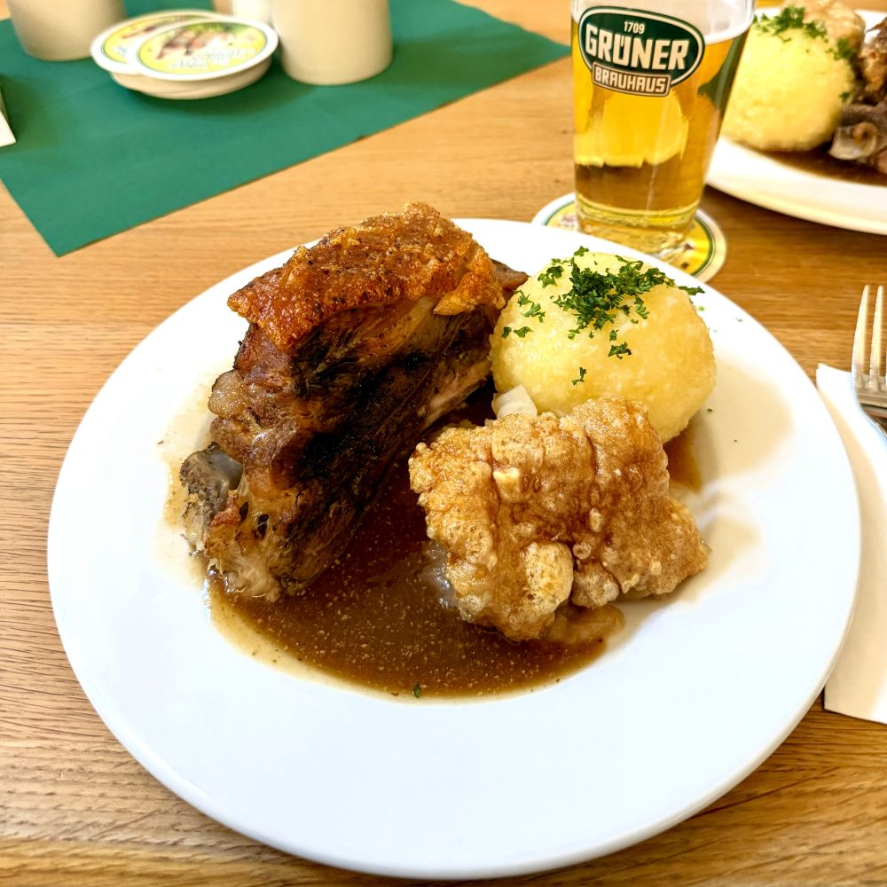 Zu sechst ging’s nun rüber in die von über 130.000 Menschen bewohnte Nürnberger Nachbarstadt, wo wir ab 11 Uhr einen Tisch im Grüner Brauhaus unweit des Fürther Hauptbahnhofs reserviert hatten. Dort stieß noch ein ins Allgäu verzogener 96er hinzu und gemeinsam labten wir uns am pro halbem Liter 4,50 € teuren Hellen der hiesigen Brauerei. Natürlich musste außerdem ein Mittagessen her und da fiel die Wahl bei fast allen auf das Schäuferla (18,20 €). Ich tanzte da als großer Fan von kross gebackenen Schweineschultern selbstredend nicht aus der Reihe.