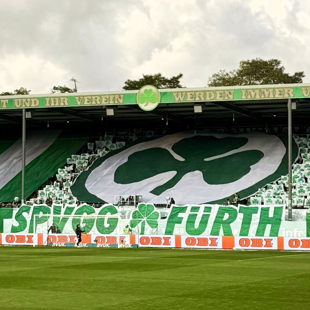 Von meinem Platz nahm ich sogleich zur Kenntnis, dass die Heimfans eine große Choreographie mit Kleeblattlogo unter dem Motto „Die Zeit ist reif – SpVgg Fürth – Mitglied werden“ vorbereitet hatten (siehe auch Titelbild). Genau wie mehrere in der Stadt aufgehängte Banner, sollte diese Aktion für eine Mitgliedschaft bei der SpVgg Greuther Fürth werben. Denn geht es nach der aktiven Fanszene und vielen weiteren Anhängern, soll dieser Vereinsname bald seinen mysteriösen Mittelteil Greuther verlieren. Den wiederum trägt man seit 1996, als die Fußballabteilung des damaligen Regionalligisten TSV Vestenbergsgreuth der Spielvereinigung Fürth (ebenfalls Regionalliga) beitrat und dadurch der Grundstein für die sportlichen Erfolge der vergangenen drei Jahrzehnte gelegt wurde.
