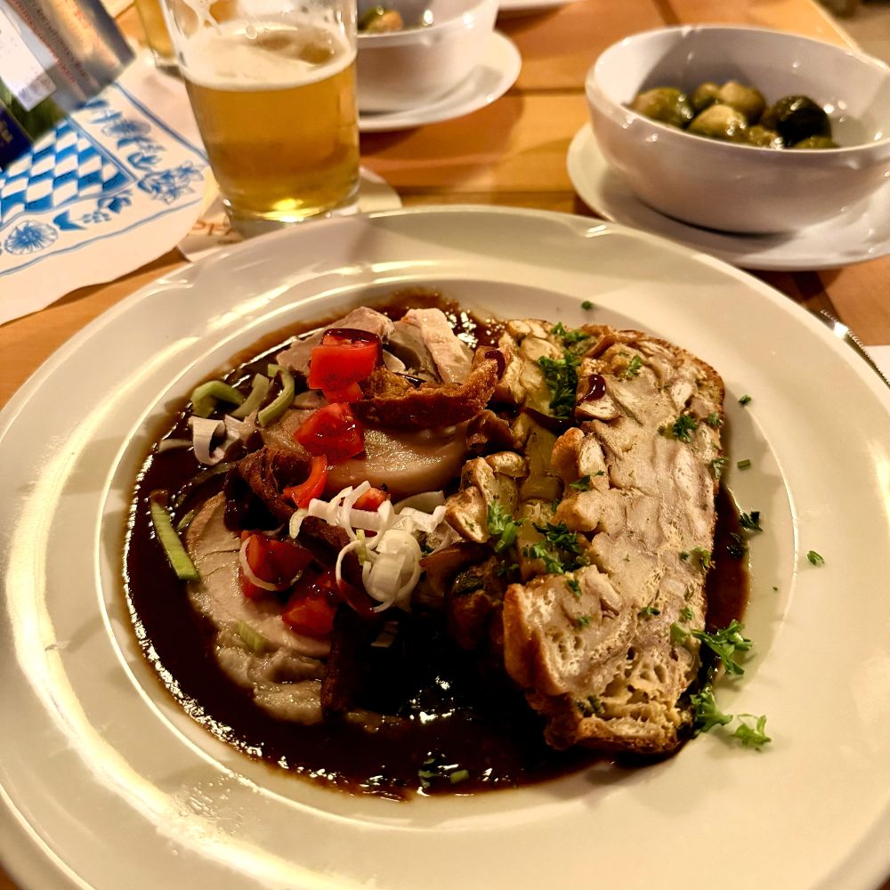 Ergo saßen wir kurz nach 18 Uhr im SophienBäck, wo unsere Betreuerin sogleich unsere erste Getränkebestellung abfragte. Als sie kurz darauf eine Runde unfiltriertes Fränkisch Hell von Pfarrbräu aus Karlstadt auf Tisch gestellt hatte, stellten wir allerdings fest, dass die aktuelle Karte leider ohne das von allen als heutiges Abendessen erhoffte Schäuferla auskommen muss. Unsere Alternative wurde indes der Spanferkelrollbraten mit Kruste, Rosenkohlröschen und Brezelserviettenknödel. Mundete auch ganz vorzüglich und wurde von einer Runde Fränkisch Rot von Landwehr Bräu aus Rothenburg ob der Tauber begleitet.