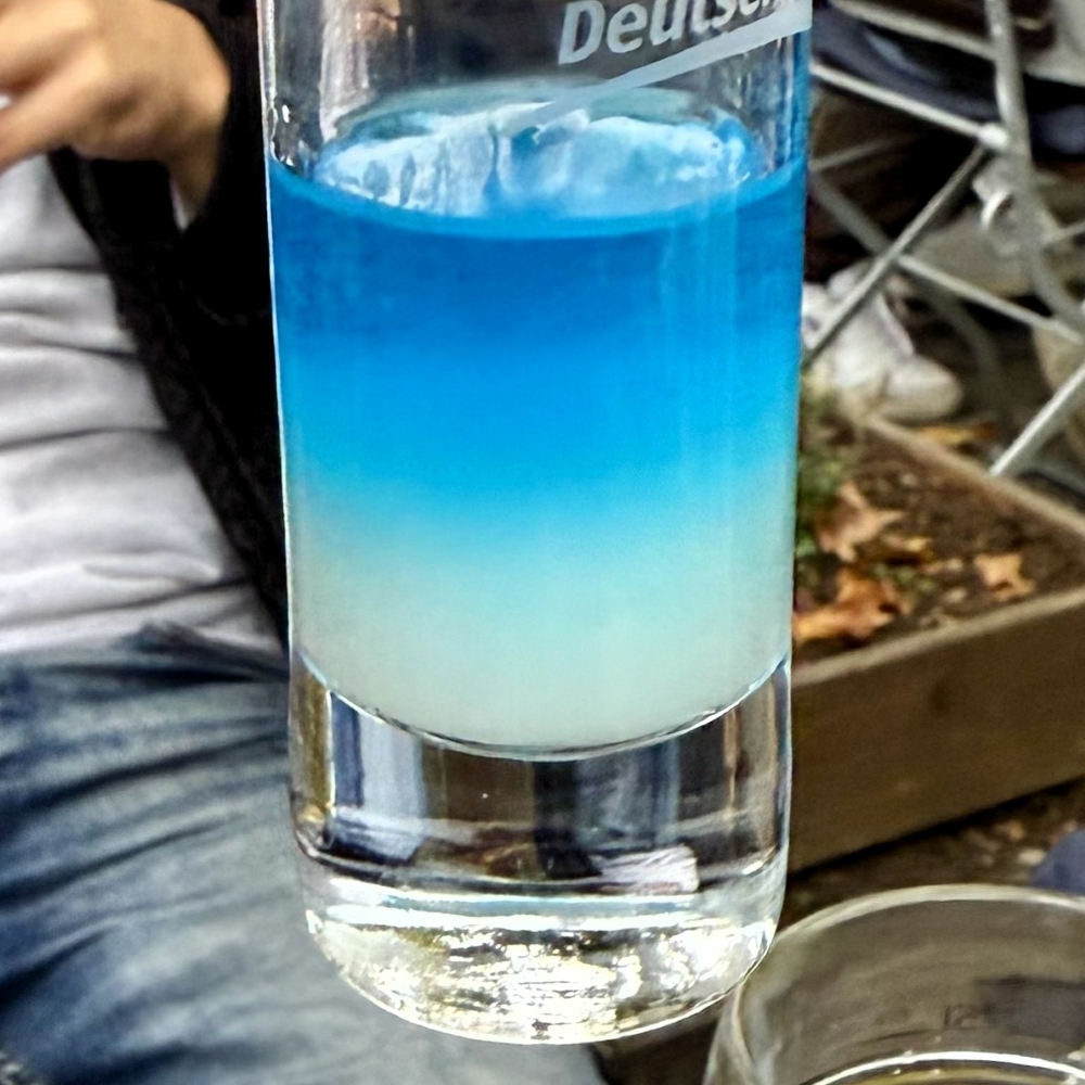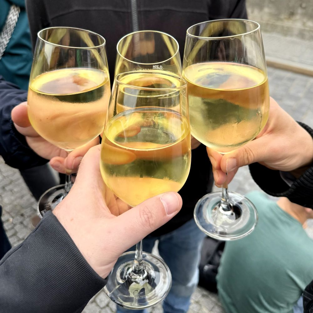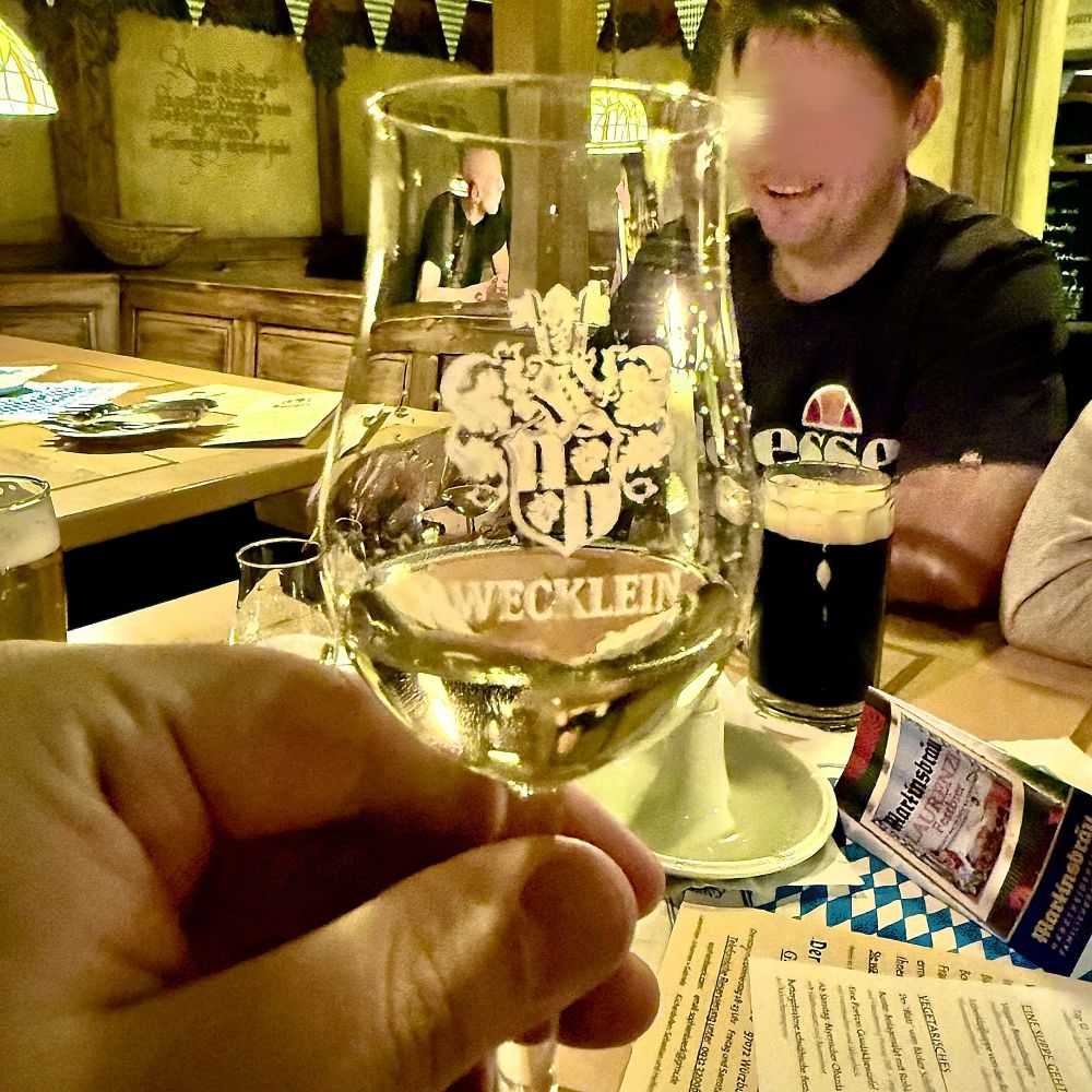 Allerdings war es zumindest für meinen Gaumen ein Fehler, dass Kai mit der Organisation des Weines beauftragt wurde. Dieser Süßschnabel holte vier Schoppen (0,25 l) Traminer à 6,50 € (+ 5 € Glaspfand) beim Weinbistro Mainwein. Der Glasinhalt war so lieblich, dass er gut als Dessertwein durchgehen konnte. Nun ja, Geschmäcker sind verschieden und delegieren will gelernt sein.