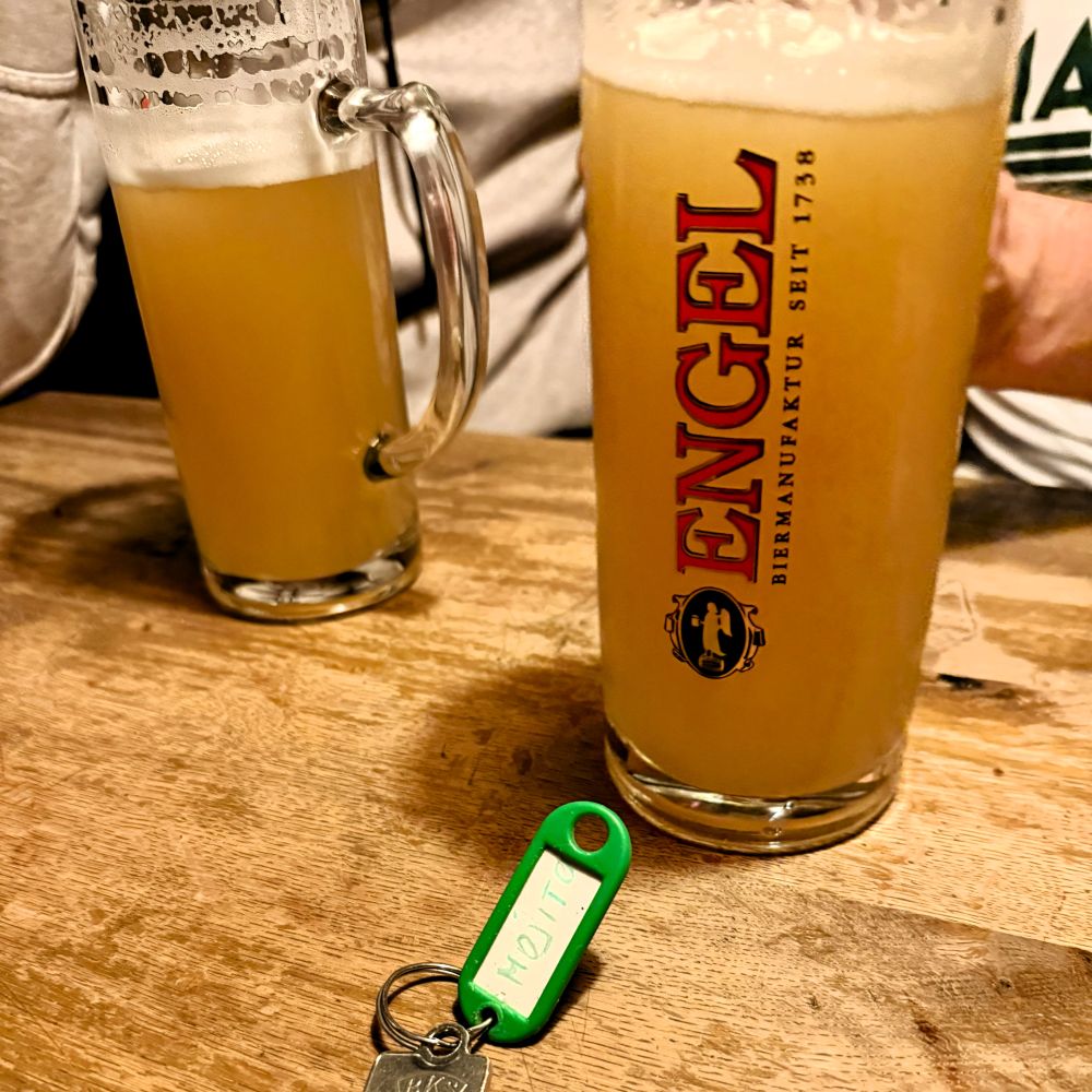 Es folgte ein Verdauungsspaziergang in Richtung Unterkunft. Doch auf Höhe des Anno Domini verließen uns die Kräfte, so dass wir dort nochmal neue Energie tanken mussten. Wenig überraschend trafen wir hier auch unsere Betreuerin wieder, die uns in der gut besuchten Kneipe gleich mal einen Tisch klärte. Rasch standen die ersehnten flüssigen Kalorien auf dem Tisch, doch aufgrund der morgigen Heimfahrt beließen wir es tatsächlich bei dieser einen Runde.