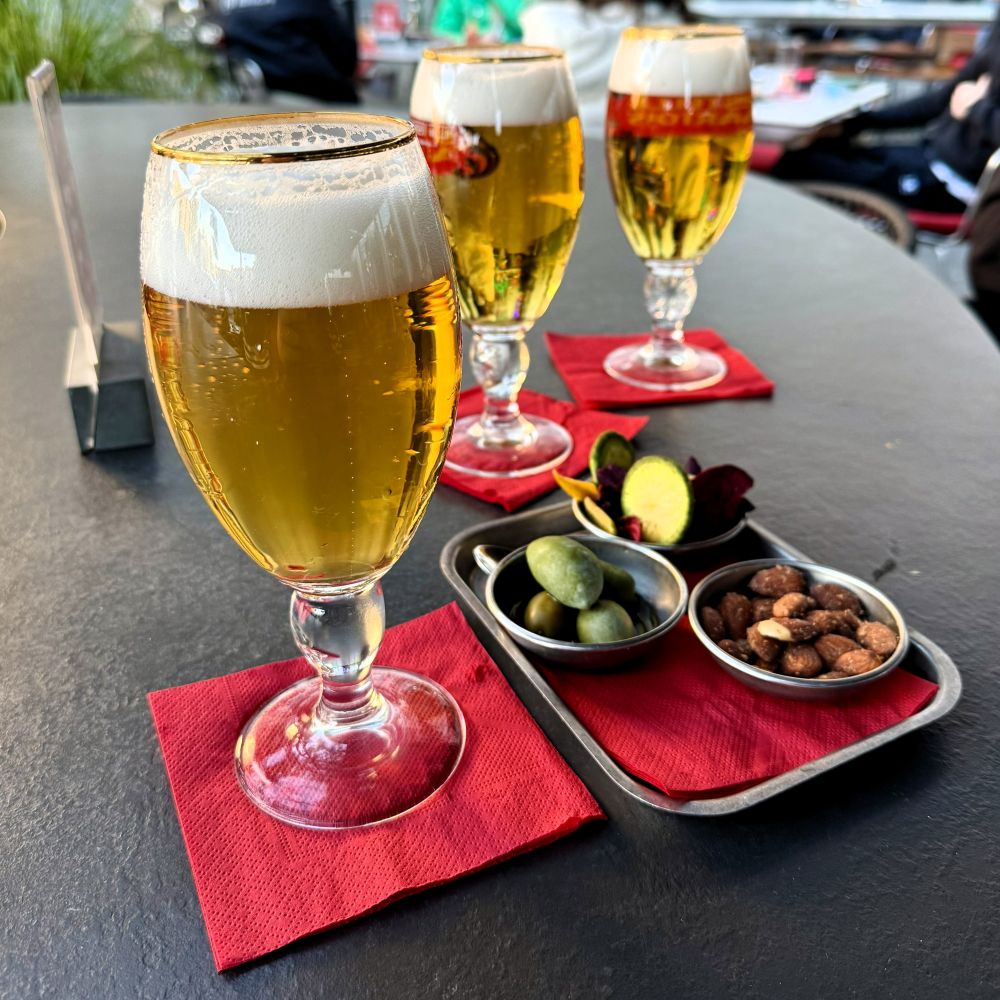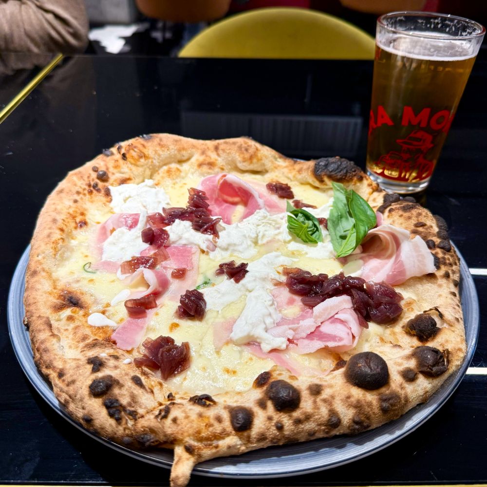 Da die Pasta für alle die erste feste Nahrung seit zehn Stunden war, gingen wir anschließend noch rüber zur Pizzeria der Markthalle. Meine Freunde teilten sich dort eine Diavola (13 €) mit Tomaten, Fior di latte, Salame spianata und Oliven, während ich noch genug Platz im Magen für eine ganze Capitelli (15 €) mit Fior di latte, Stracciatella, Pancetta cotta und karamellisierten Zwiebeln hatte. Außerdem musste natürlich auch eine zweite Runde Baffo d’oro her, die wieder mit 18 € zu Buche schlug.