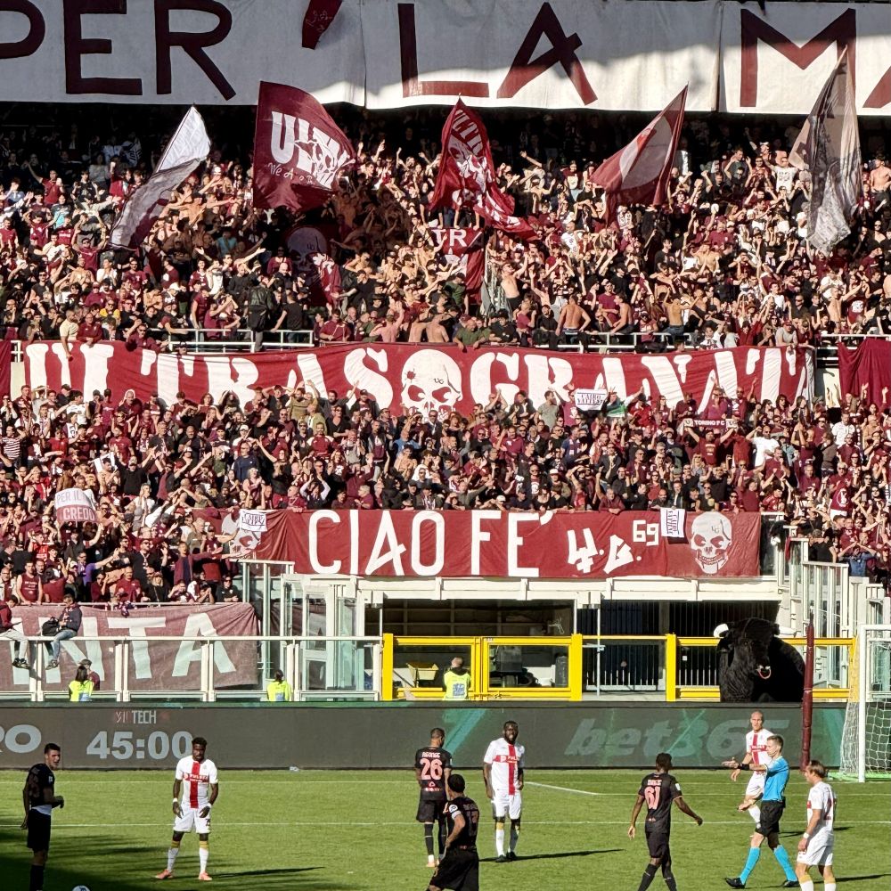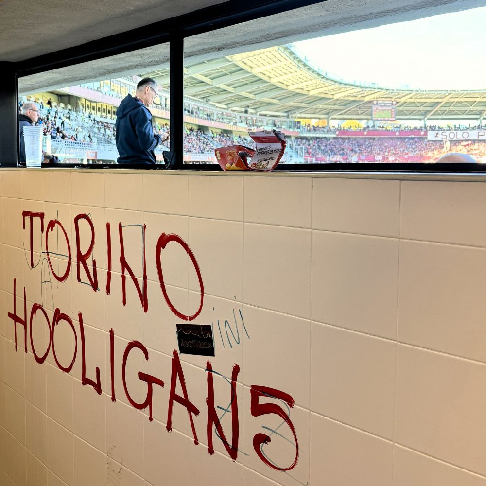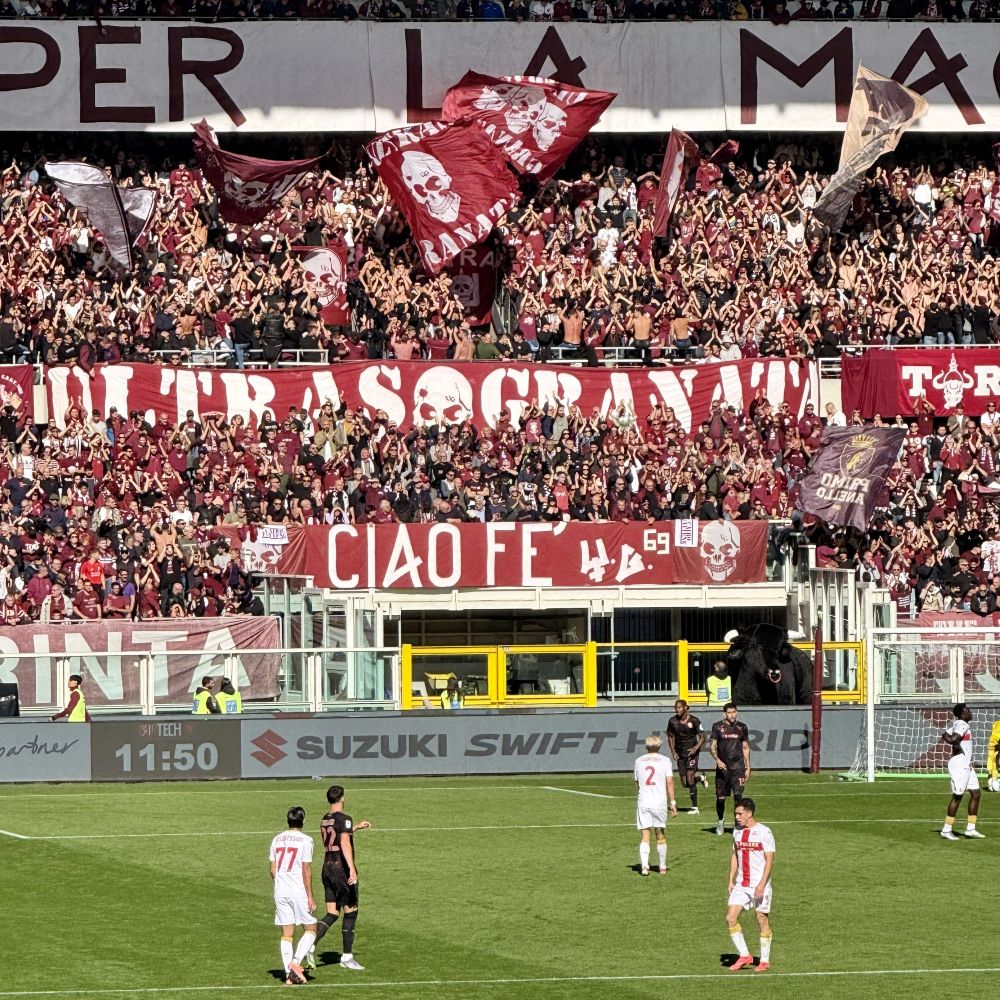 Wir hatten heute 25 € teure Tickets links neben den Hooligans und bekamen sogleich per Handzettel mitgeteilt, dass die Gruppe sich auch nach ihrer Rückkehr massiver Repression ausgesetzt sieht. Mit den Ultras Granata herrscht hingegen mittlerweile eine Art Burgfrieden. So verbindet die Kurven neben der Liebe zum granatroten Trikot auch die Abneigung gegenüber Urbano Cairo. Jener Mann ist seit 2005 Clubeigentümer, doch in den vergangenen zwei Dekaden kam dabei wenig Erbauliches zustande. Daher gab es bereits mehrere Fandemos gegen Cairo und im Stadion wird bei jedem Spiel mit Bannern und Sprechchören sein Abgang gefordert.