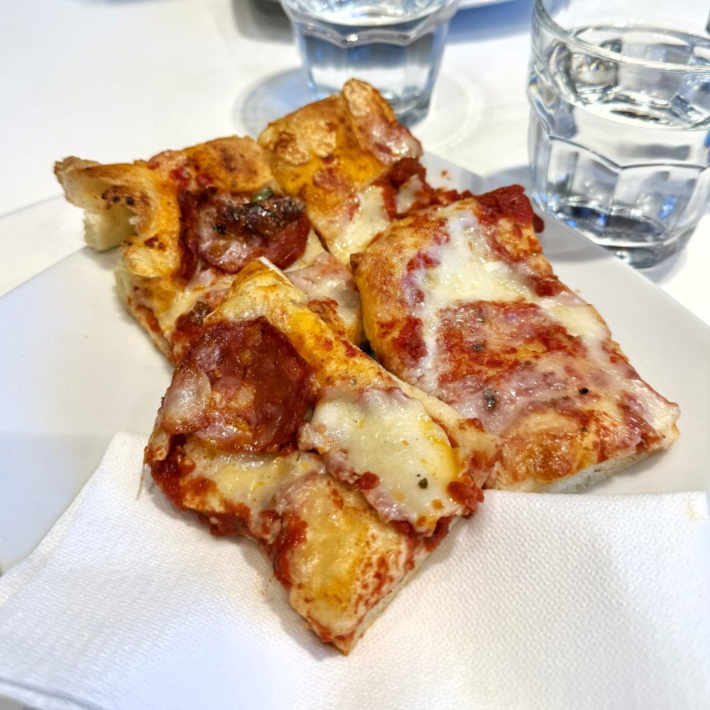 Nach dem Spiel sollte es natürlich wieder per Tram ins Stadtzentrum gehen. Allerdings stoppten wir unterwegs nochmal für einen kleinen Imbiss in einem Café an der Haltestelle Vinzaglio. Im Caffè Corner gab es für jeden eine deftige Kleinigkeit – meinerseits ein 3,50 € teures Stück Blechpizza mit Salame piccante – und ein Fläschen Wasser (1,50 €).