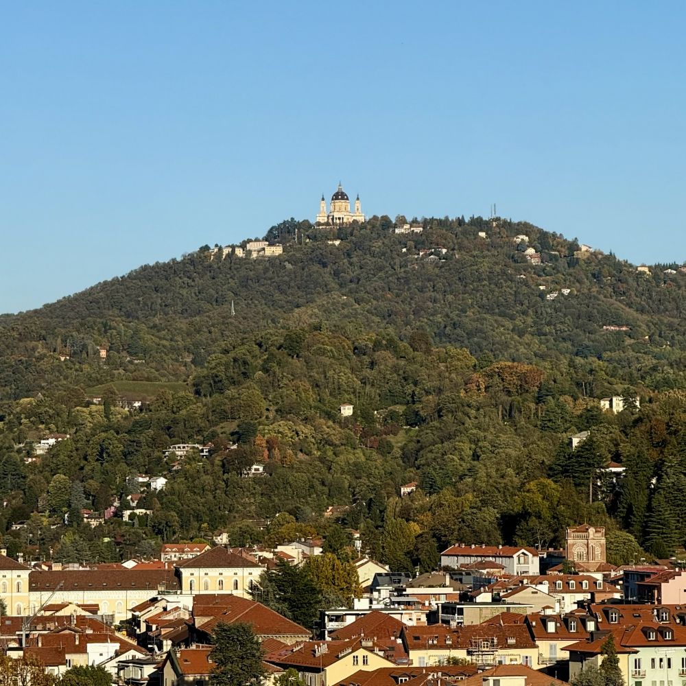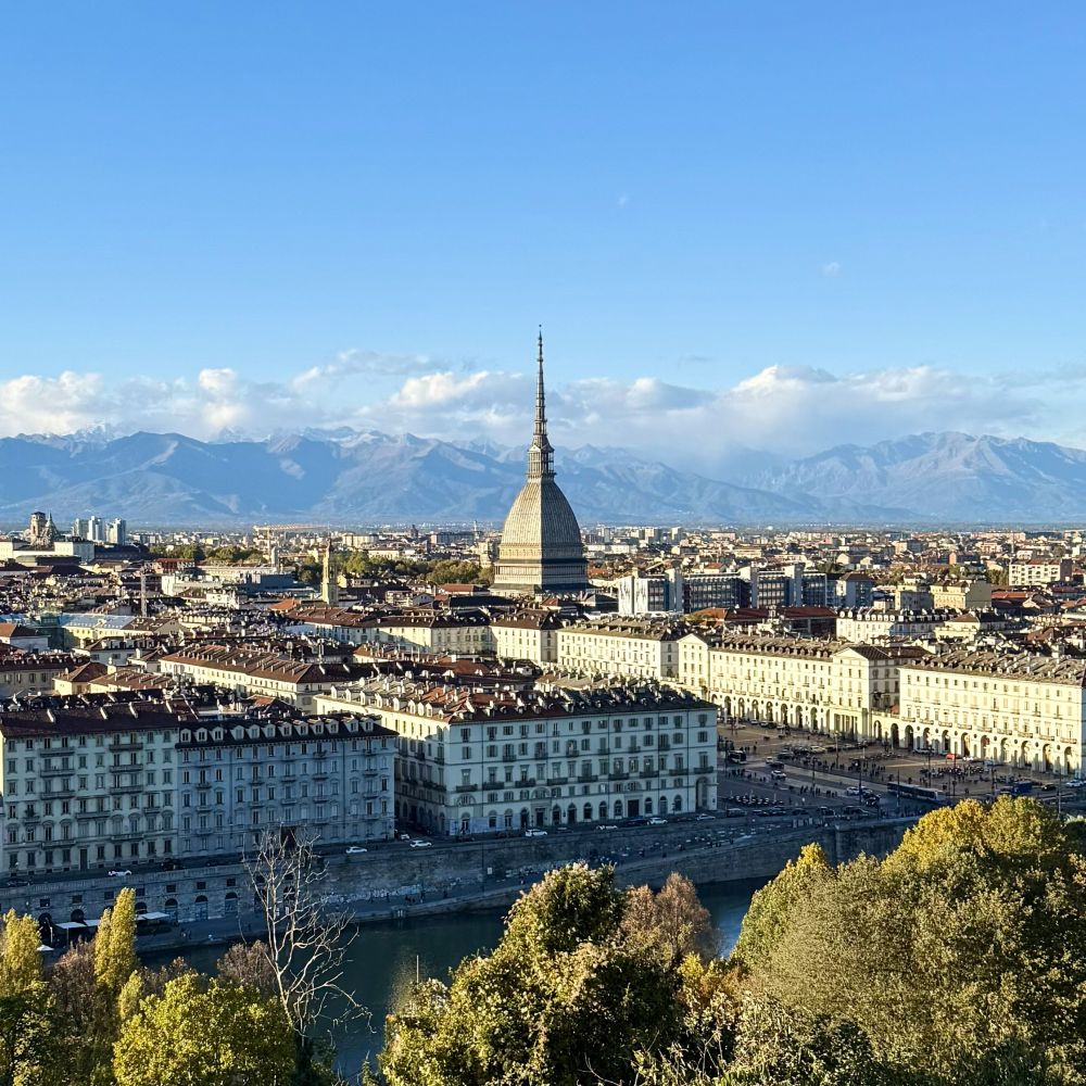 Einen ersten Überblick wollten wir uns vom Monte dei Cappuccini (325 m ü. NN) verschaffen. Dazu mussten wir die Innenstadt einmal per Bus bis zum Ufer des Po durchqueren und nach der Überschreitung des Flusses ein paar Höhenmeter machen. Aber die lohnten sich sehr. Wir hatten von dem mit einem Kapzinerkloster aus der Renaissance (16. Jahrhundert) gekrönten Hügel ein fantastisches Panorama. Die gesamte Stadt war zu überblicken und am Horizont grüßten die Gipfel der Alpen.