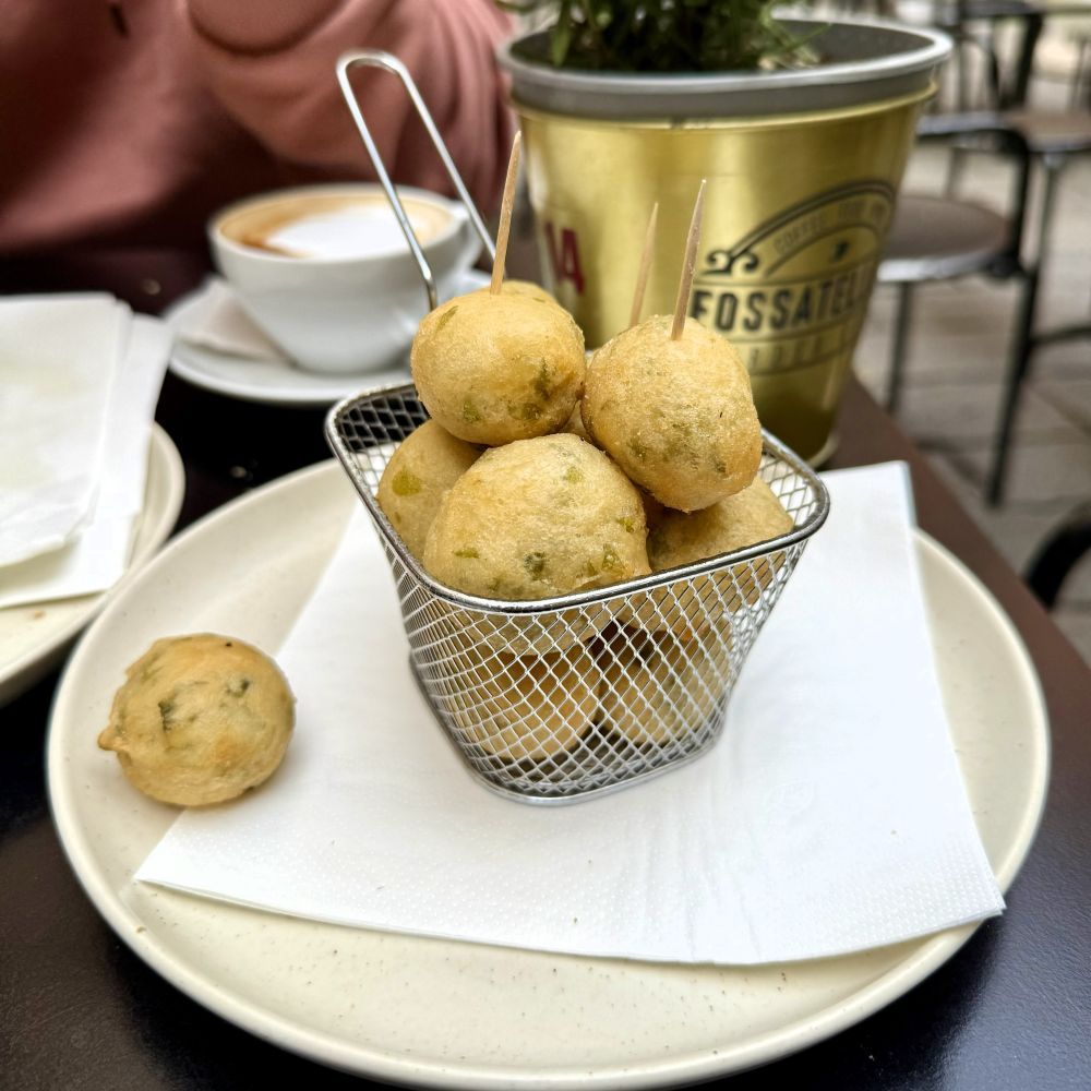 Letztlich wurden es gegen 11 Uhr die Außenplätze der Caffetteria Lomellini auf der Piazza di Fossatello. Prompt waren drei Cappuccini, drei Focacce mit Prosciutto cotto und ein Körbchen Zeppoline di alghe geordert (kostete alles zusammen 28 €). Letzteres sind übrigens frittierte Algenbällchen, die zwar bisher keiner von uns kannte, uns in der Vitrine des Cafés jedoch irgendwie angelacht hatten. Fanden wir bei der Premiere auf der Zunge unisono schmackhaft.