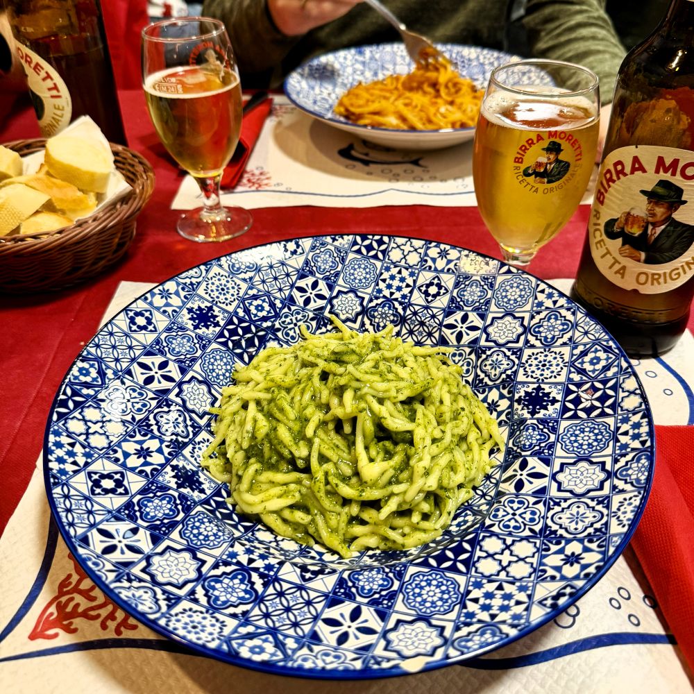 Gegen 20:30 Uhr schlenderten wir dann einmal über die Straße zum Ristorante Home an der Piazzetta San Carlo. Als Primi piatti orderte der Miesmuscheltaucher Gianluca die Spaghetti con le cozze, während Johnny mit den Tagliatelle al ragù einen kulinarischen Kurzausflug in die Emilia-Romagna machte. Mir gefiel es in Ligurien hingegen so gut, dass ich mich für das typischste Nudelgericht der Region entschied: Trofie al pesto genovese.