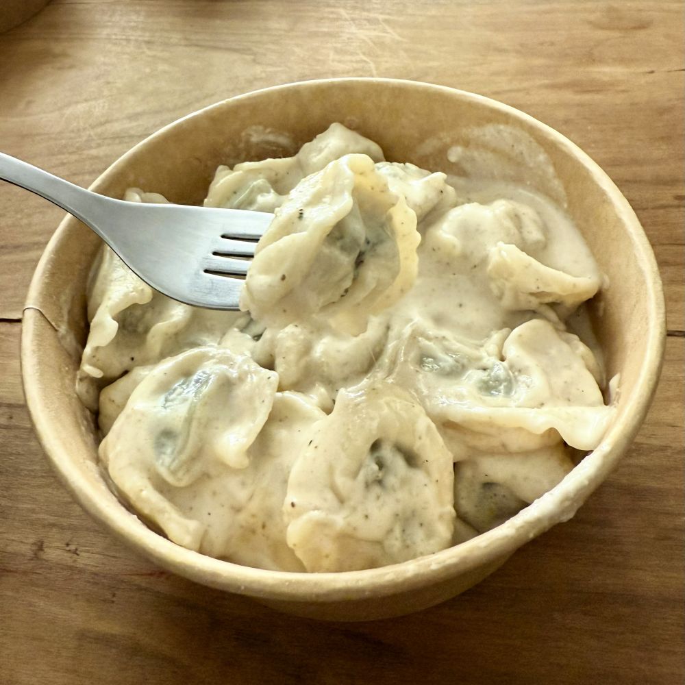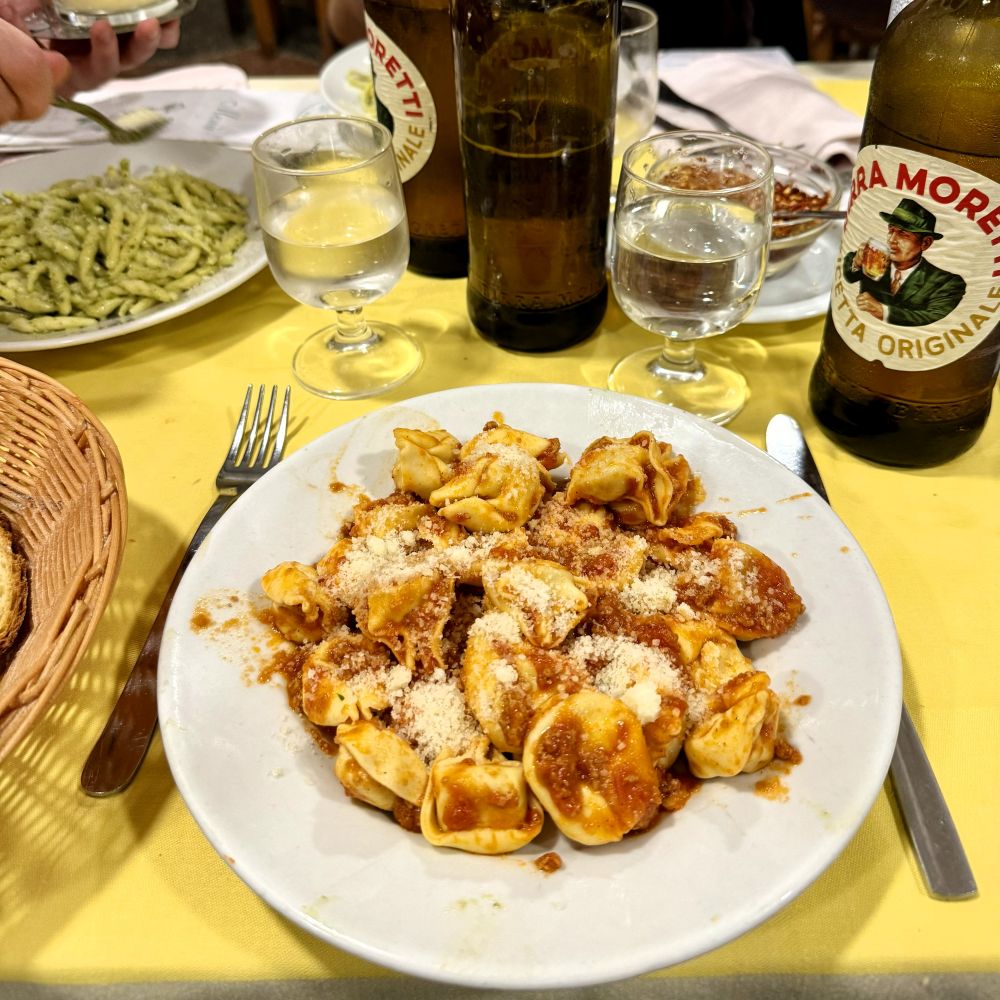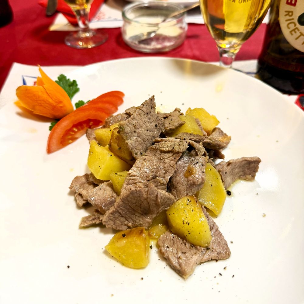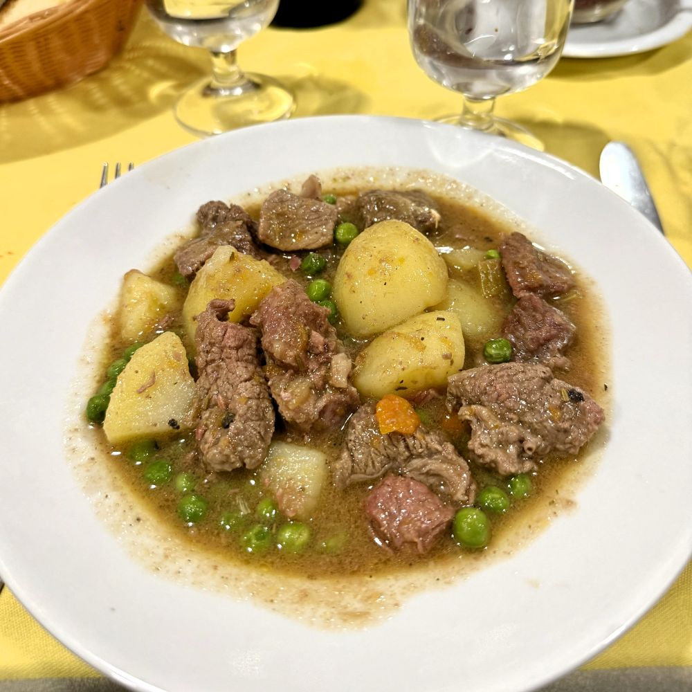 Zwischen all der Bespaßung war aber auch Zeit für die Wahl des ersten Gangs gewesen. Trofie al pesto genovese bei Gianluca, Tagliatelle al pesto genovese bei Johnny und Tortellini al ragù bei mir. Kaum waren unsere Antipasti verputzt, stand sogleich die bestellte Pasta auf dem Tisch. Danach waren 66 % der Reisegruppe allerdings bereits so satt, dass sie auf einen zweiten Gang verzichteten. Ich hielt indes die Fahne hoch und bestellte als Secondo wenigstens noch Spezzatino di manzo. Kaum hatte ich meinen neugierigen Freunden erklärt, was sich dahinter verbirgt, stand das Schmorgericht auch schon vor mir.