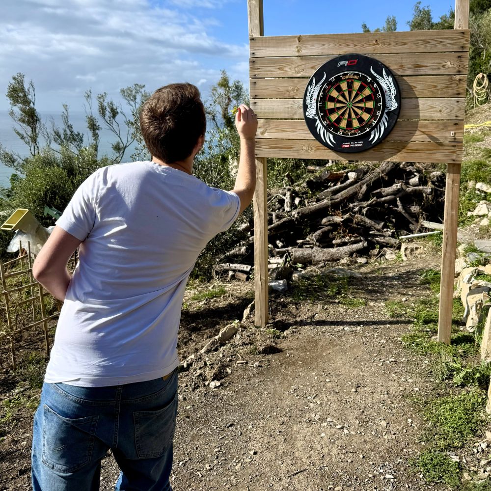 Vom Sentiero Verde Azzurro bot sich ein toller Ausblick auf das blaue Meer und als wir die ersten 2,8 Kilometer und 199 Höhenmeter gemeistert hatten, lud auf halber Strecke zwischen Corniglia und Vernazza ein kleiner Getränkestand zur Rast ein. Der leutselige Betreiber Sergio durfte uns dort nicht nur drei hausgemachte Zitronenlimonaden à 4 €, sondern auch leihweise seine Dartpfeile reichen. Denn auf Sergios Grund steht eine Scheibe für Matches mit Meeresblick parat, auf die laut seiner Aussage auch schon die Profis Mensur Suljović und Jonny Clayton ein paar Pfeile geworfen haben.
