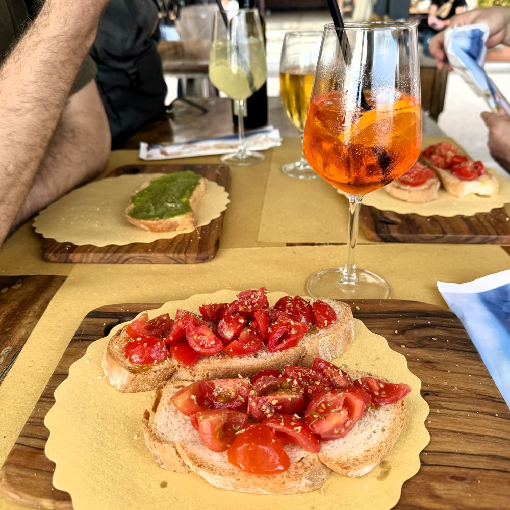Ich weiß nicht wie touristisch es dort in der Hauptsaison zugeht. Aber an diesem Montagnachmittag Ende Oktober war wenig los und in den Bars am Wasser herrschte freie Platzwahl. So gönnten wir uns zunächst auf den Außenplätzen der Dindi Bar einen Aperol Spritz (7 €), respektive Limoncello Spritz (8,50 €). Anschließend wechselten wir zur Strandbar La Strambata, wo wir uns Moretti India Pale Ale (6 €) und abermals Limoncello Spritz (7 €) orderten.
