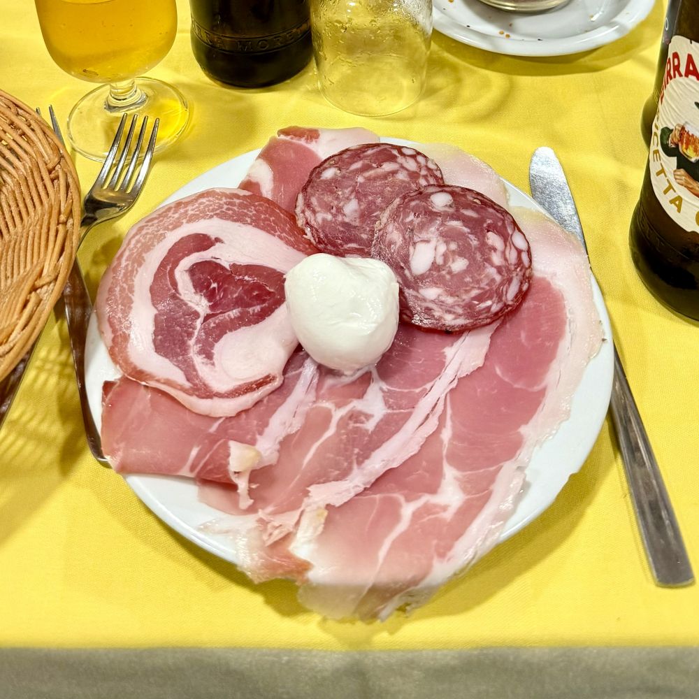 Der mutmaßlich vom afrikanischen Kontinent stammende Kellner organisierte uns nun blitzschnell zwei weitere Biere und fragte beim Servieren direkt nach unseren Vorspeisenwünschen. Es wurde einmal die Fischplatte mit Lachs, Muscheln und Oktopus und zweimal die Aufschnittplatte mit Salami, Schinken, Speck und Fior di latte. Als wir 96 Sekunden später unsere Teller auf dem Tisch stehen hatten, erlaubte sich unser Servierer etwas Smalltalk. Wo wir herkommen und so weiter… Er entgegnete uns nun: „Ah cool, mein Bruder am Nachbartisch kommt auch aus Deutschland. Mit ihm könnt ihr euch auf deutsch unterhalten.“ Besagtem Mann haben wir natürlich prompt einen guten Appetit in unserer Muttersprache gewünscht, woraufhin er nur erwiderte „Sorry, aber der Typ erzählt nur Mist. Ich komme aus Nigeria und kann kein Wort Deutsch.“