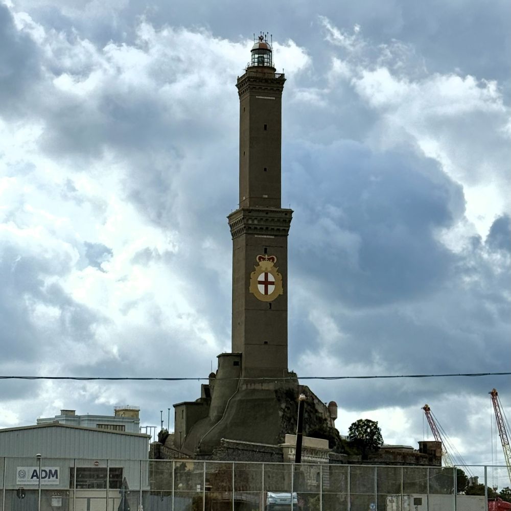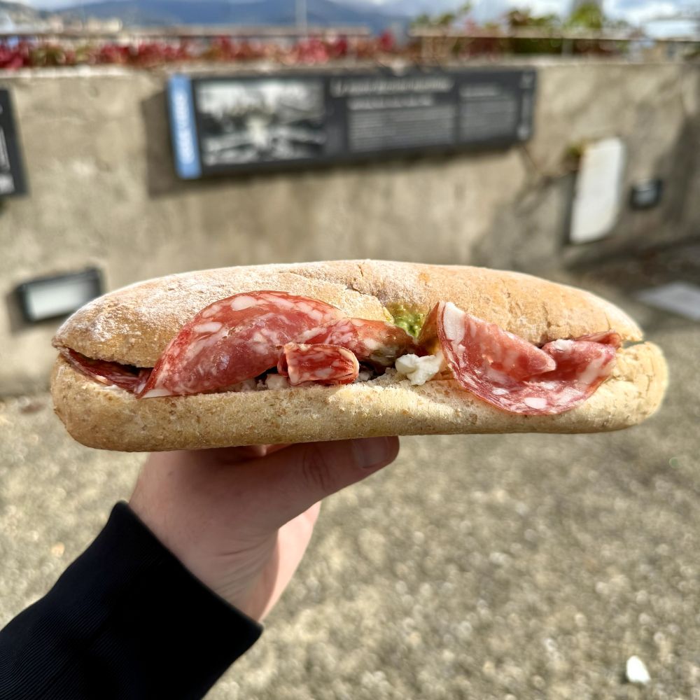 Vormittags votierten wir für einen Ausflug zum Torre della Lanterna. Auf dem Weg zu diesem 76 m hohen Leuchtturm aus dem 16. Jahrhundert deckten wir uns beim Panino Doc außerdem mit drei Crêuza de mä** à 5 € ein. Jene mit Salame genovese di Sant’Olcese, Stracchino und Pesto genovese belegten Panini wollten wir dann gegen 12 Uhr als spätes Frühstück am Fuße des Leuchtturms genießen. Doch heute war das Gelände komplett für den Publikumsverkehr geschlossen, so dass wir uns ein paar hundert Meter entfernt ans Wasser setzen mussten.