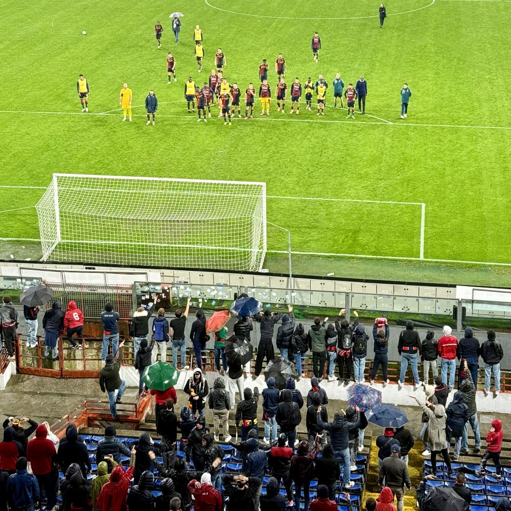 Letztlich durfte das Spiel jedoch ein reguläres, wenngleich für die Heimseite mehr als frustrierendes Ende finden. Nichtsdestotrotz hatte die Mannschaft nach dem Schlusspfiff noch die Courage sich dem wütenden Publikum zu stellen. Sie nahmen nacheinander vor jeder Tribüne Aufstellung, um dort jeweils beleidigt und ausgepfiffen zu werden. Wir blieben ebenfalls noch ein wenig und als sich die Reihen lichteten, wurden wir noch von ein paar Ultras der Grifoni della Sud angequatscht. Sie entschuldigten sich dafür, dass wir so eine Scheißmannschaft sehen mussten und wir wünschten ihnen so bald wie möglich wieder bessere Zeiten.