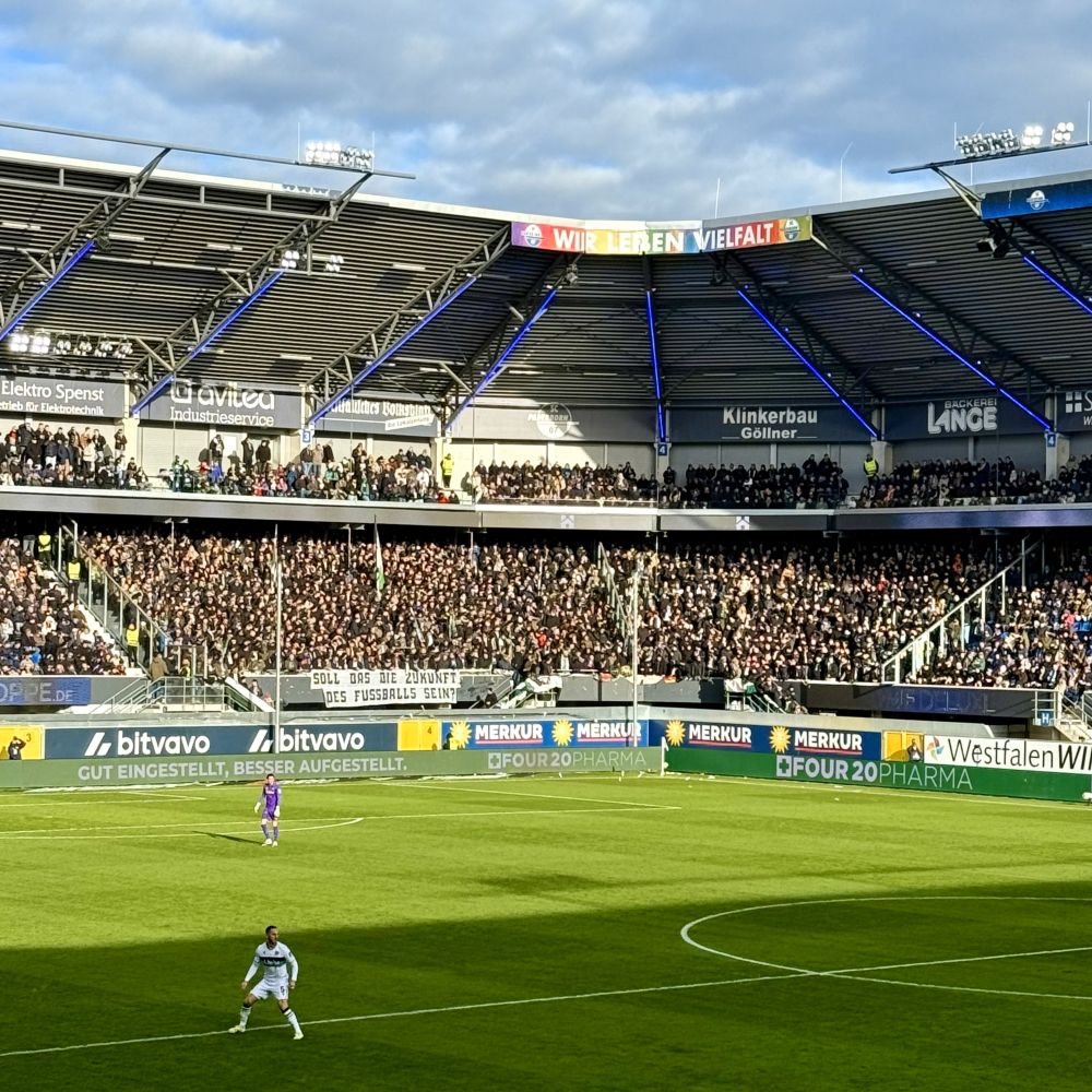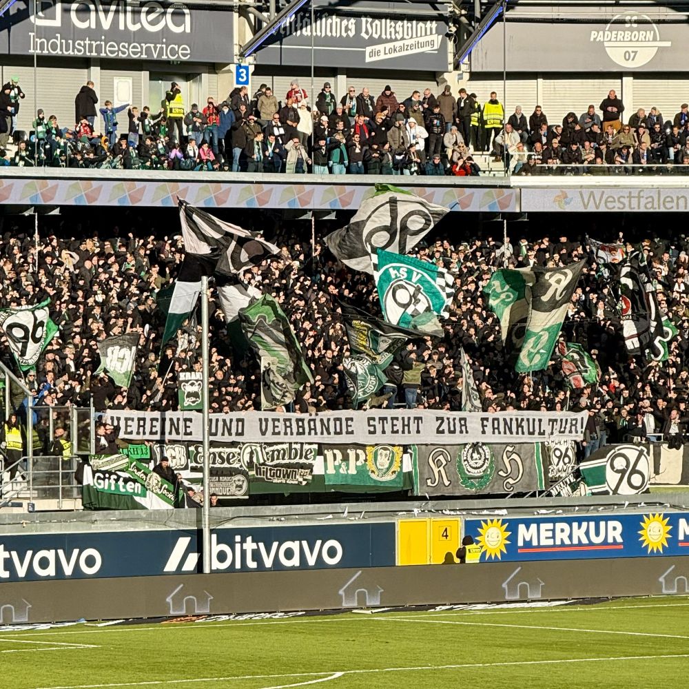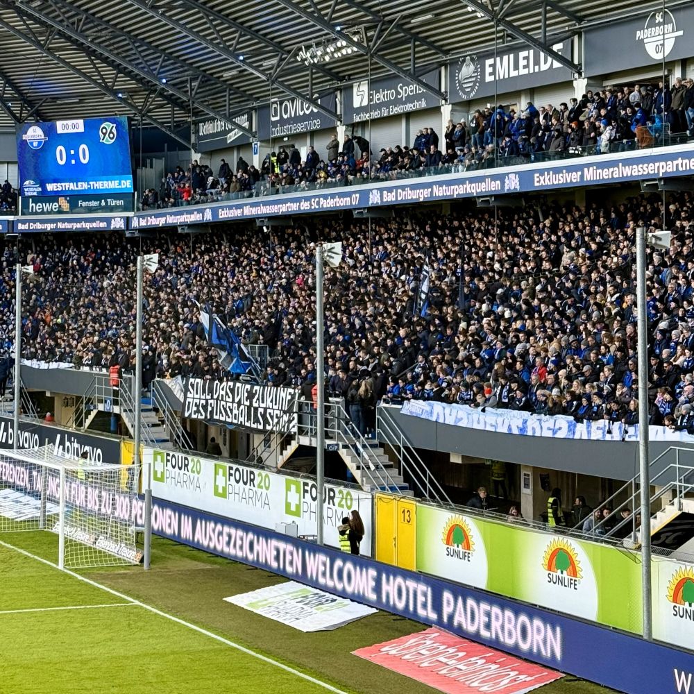 An dieser neuerlichen Protestaktion beteiligten sich selbstredend auch die Fanszenen des SC Paderborn und des Hannoverschen SV, so dass beim heutigen Spiel ab 13:00 Uhr zunächst eine gespenstische Stille herrschte. Außerdem fehlte es auf Rängen während des Protests an Zaun- und Schwenkfahnen, wodurch optisch ebenfalls keine Fankultur erkennbar war. Alles per Banderole mit dem Leitmotiv „Soll das die Zukunft des Fußballs sein?“ untertitelt. Da dürfte die Antwort von den Kurven über die Logen bis hin zu den Chefetagen des Fußballgeschäfts sehr einträchtig „Nein, bitte nicht!“ lauten. Schließlich brechen die deutschen Zuschauerzahlen insbesondere aufgrund der lebendigen Fankultur einen Rekord nach dem anderen. Und dieser hohe Zuschauerzuspruch ist wiederum sehr relevant für eine erfolgreiche Vermarktung.