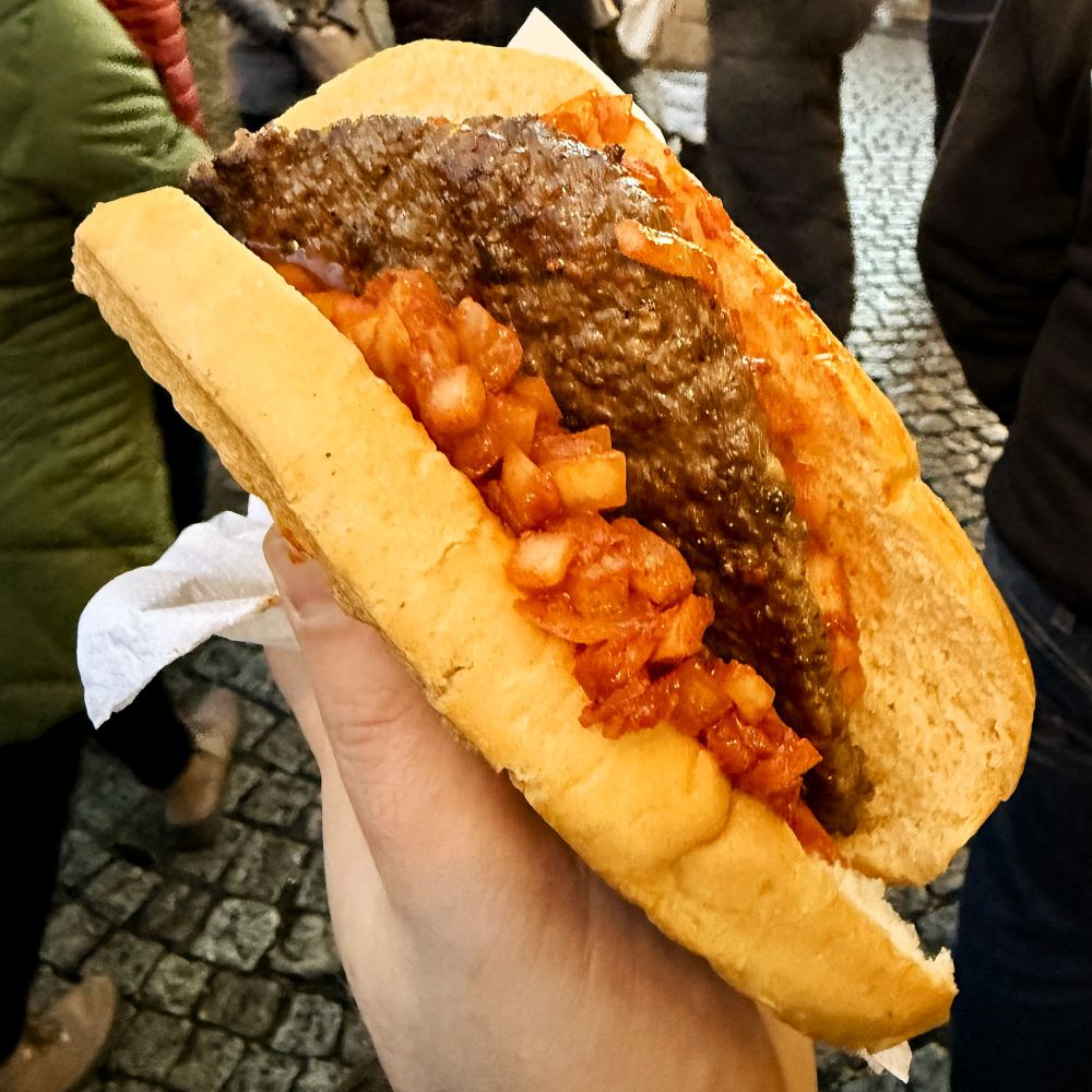 Nach Spielende trennten sich sogleich die Wege von Lumi und mir, da ich zeitnah die Heimreise antreten musste. Zurück nutzte ich nämlich mein Deutschlandticket, weil ich kurzfristig kein günstiges Fernverkehrsticket mehr ergattern konnte. Abfahrt meiner erstbesten Verbindung war bereits um 16:09 Uhr in Spandau. Nichtsdestotrotz blieb mir noch Zeit für ein vorgezogenes Abendessen auf dem Spandauer Weihnachtsmarkt. Es wurde eine Pljeskavica mit Käsefüllung, welche an einem Grillstand mit Chilizwiebeln im Fladenbrot gereicht wurde (7,80 €).