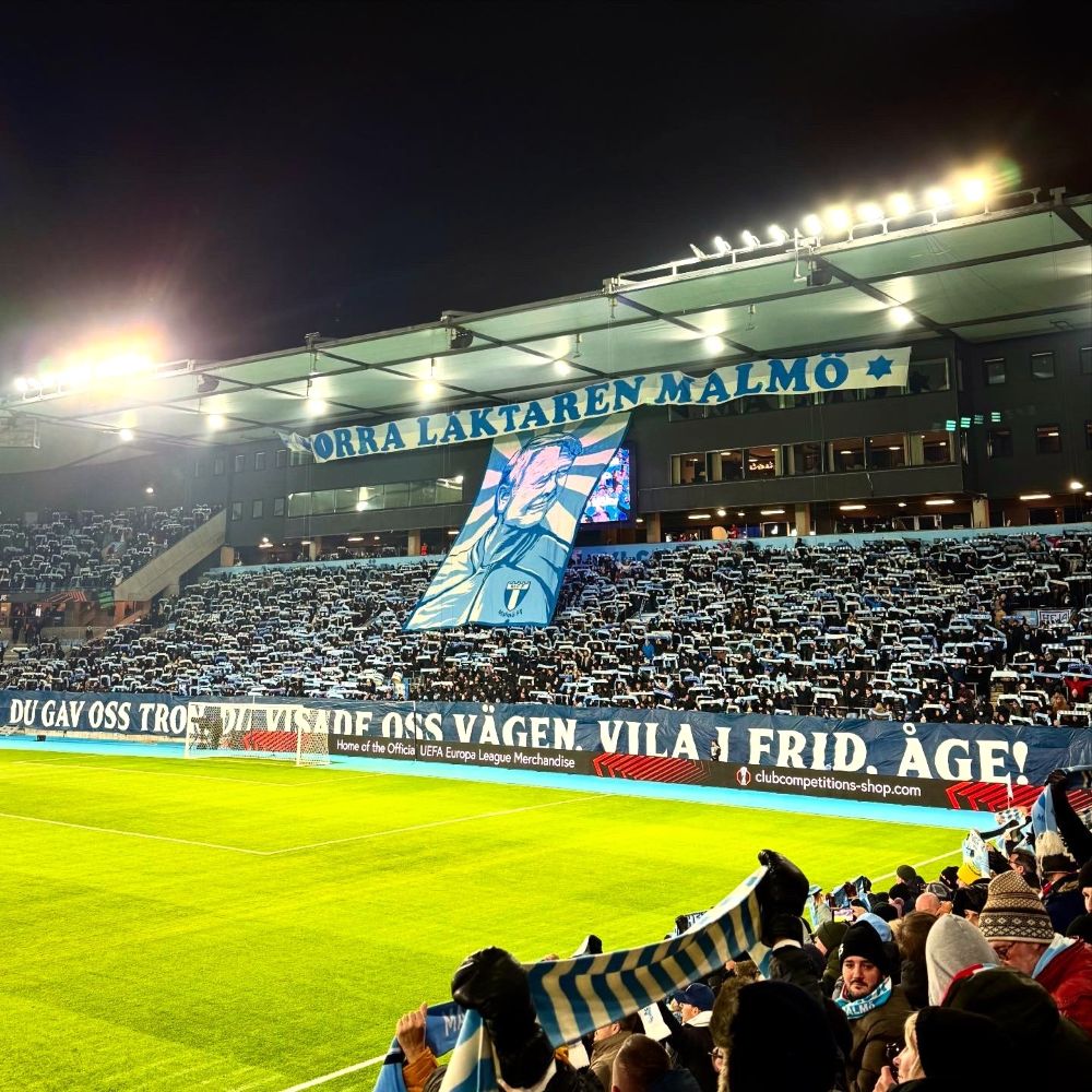 Die Norra Läktaren (Nordtribüne), wo u. a. die Gruppen Supras, Rex Scania und Block 3 für die Stimmung sorgen, war jedoch voll ausgelastet. Auch eine optische Aktion hatte man vorbereitet, wenngleich der Anlass leider ein trauriger war. So gedachte man dem im Dezember verstorbenen früheren Erfolgstrainer Åge Hareide* mit den Abschiedsworten „Du gav oss tron, du visade oss vägen. Vila i frid, Åge” (Du hast uns den Glauben gegeben, du hast uns den Weg gezeigt. Ruhe in Frieden, Åge), sowie einer Blockfahne mit seinem Konterfei.