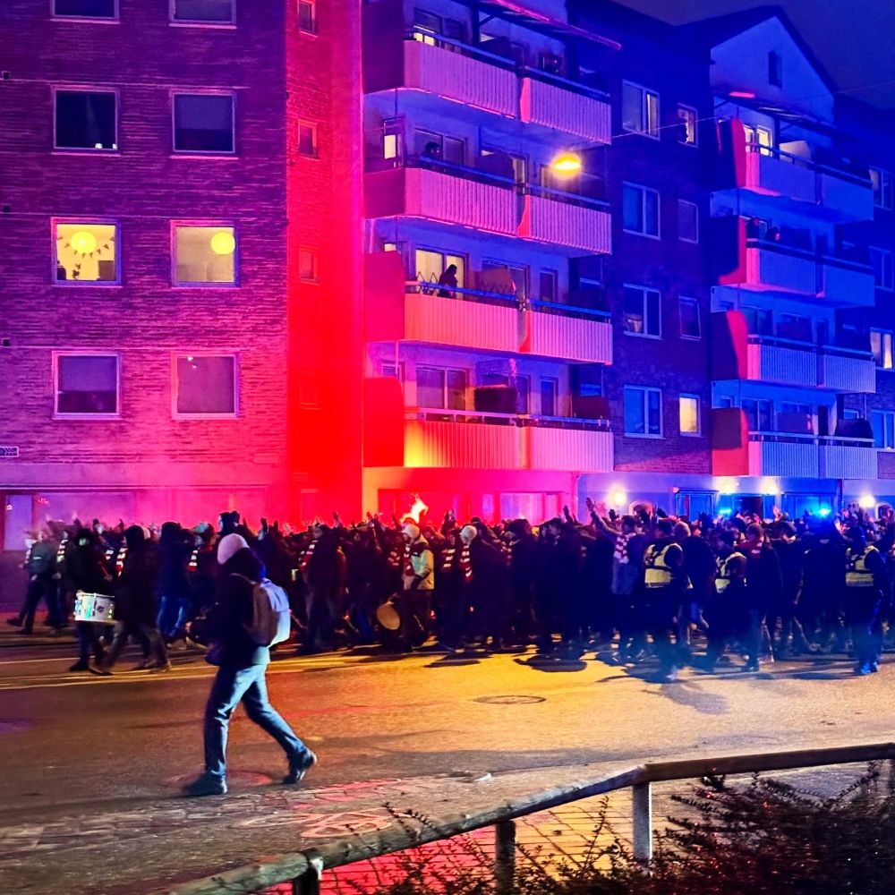 Ich machte die Vorhut, fand auf der Route aber leider keine schöne exponierte Stelle für richtig gutes Bildmaterial. Nichtsdestotrotz weiß ich von einem sanges- und fackelfreudigen Marsch mit über 1.000 Teilnehmern zu berichten. Weil Iris Spranger oder Daniela Behrens in Malmö nichts zu melden haben, waren dabei übrigens weder verletzte Fans, noch verletzte Beamte zu beklagen. Ich mein, klar, schwedische Fußballfans können dir auch genug Schlechtes über ihre Polizei erzählen. Aber im internationalen Vergleich wird hier meines Erachtens doch noch mehr auf Deeskalation gesetzt.