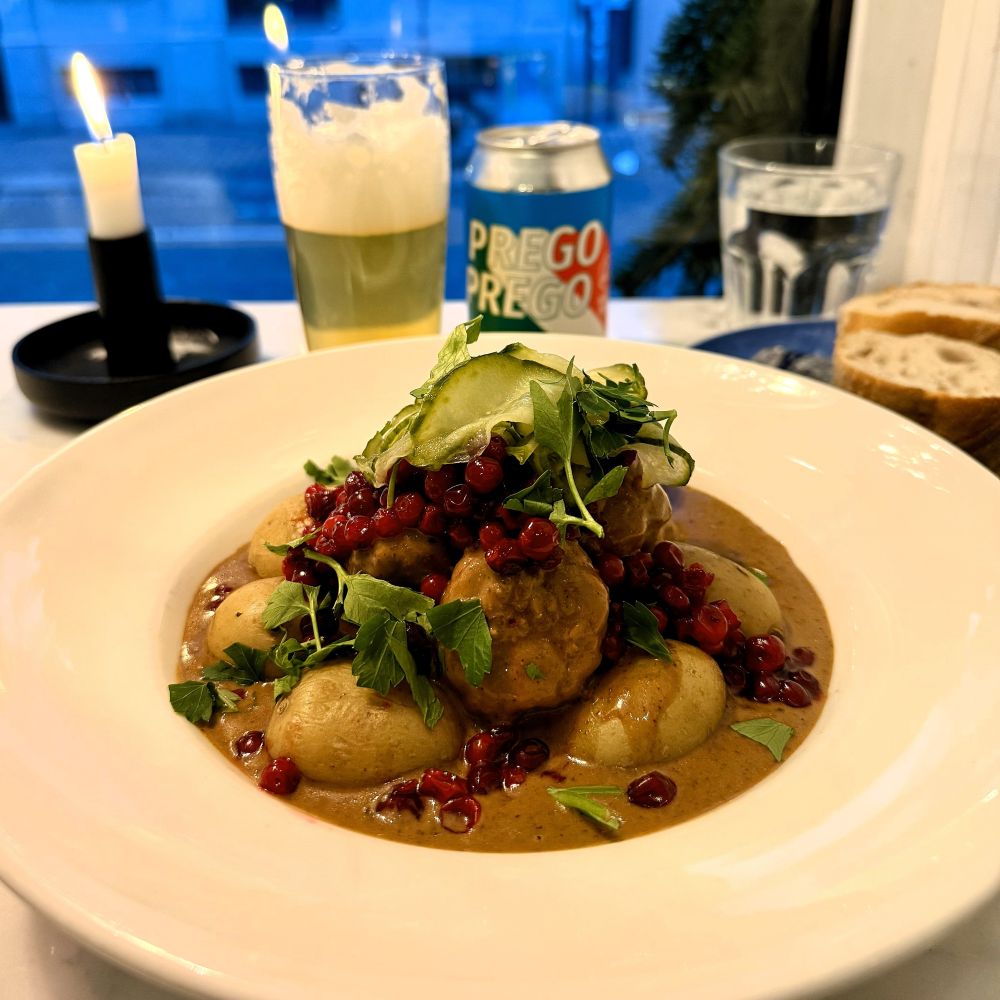 Da bisher nur ein in Hamburg erstandenes Franzbrötchen für Kalorienzufuhr gesorgt hatte, musste nach dem Check-in dringend ein verspätetes Mittagessen her. Die Wahl fiel auf die Spoonery im Zentrum von Schwedens drittgrößter Stadt (ca. 334.000 Einwohner). In jenem Lokal ließ ich mir sieben leckere Köttbullar in Rahmsauce, nebst gekochten Drillingen, frischen Preiselbeeren und Gurkensalat reichen. Im Preis von 148 SEK (ca. 14 €) waren außerdem Brot, Butter und Wasser soviel man wollte inkludiert. Nichtsdestotrotz gönnte ich mir auch noch ein schwedisches Italian Style Lager namens Prego, Prego für 75 SEK (ca. 7 €), welches in einer kleinen Brauerei unweit von Malmö produziert wird.