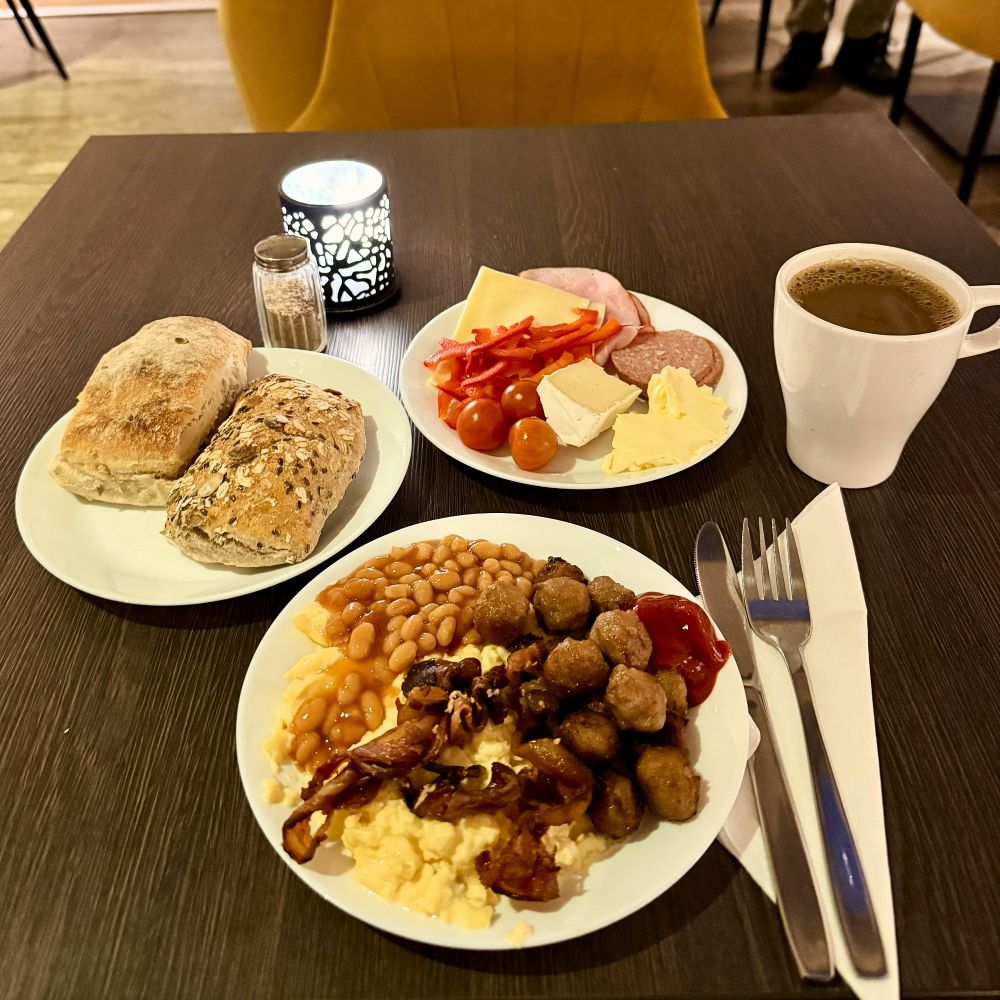 Am nächsten Morgen wachte ich mangels Abendessen ziemlich hungrig auf. Zum Glück wurde das Frühstücksbuffet bereits um 6:30 Uhr eröffnet. Ich freute mich dort einerseits über Brötchen und Aufschnitt und andererseits musste die Warmtheke natürlich auch geplündert werden. Für ein preiswertes Mittelklassehotel war die Auswahl und Qualität ziemlich ansprechend. Wunderte mich eh, dass die Zimmer hier trotz Europapokalspiel von Malmö FF und Handball-EM so günstig angeboten wurden. Denn die Auslastung war durchaus hoch.