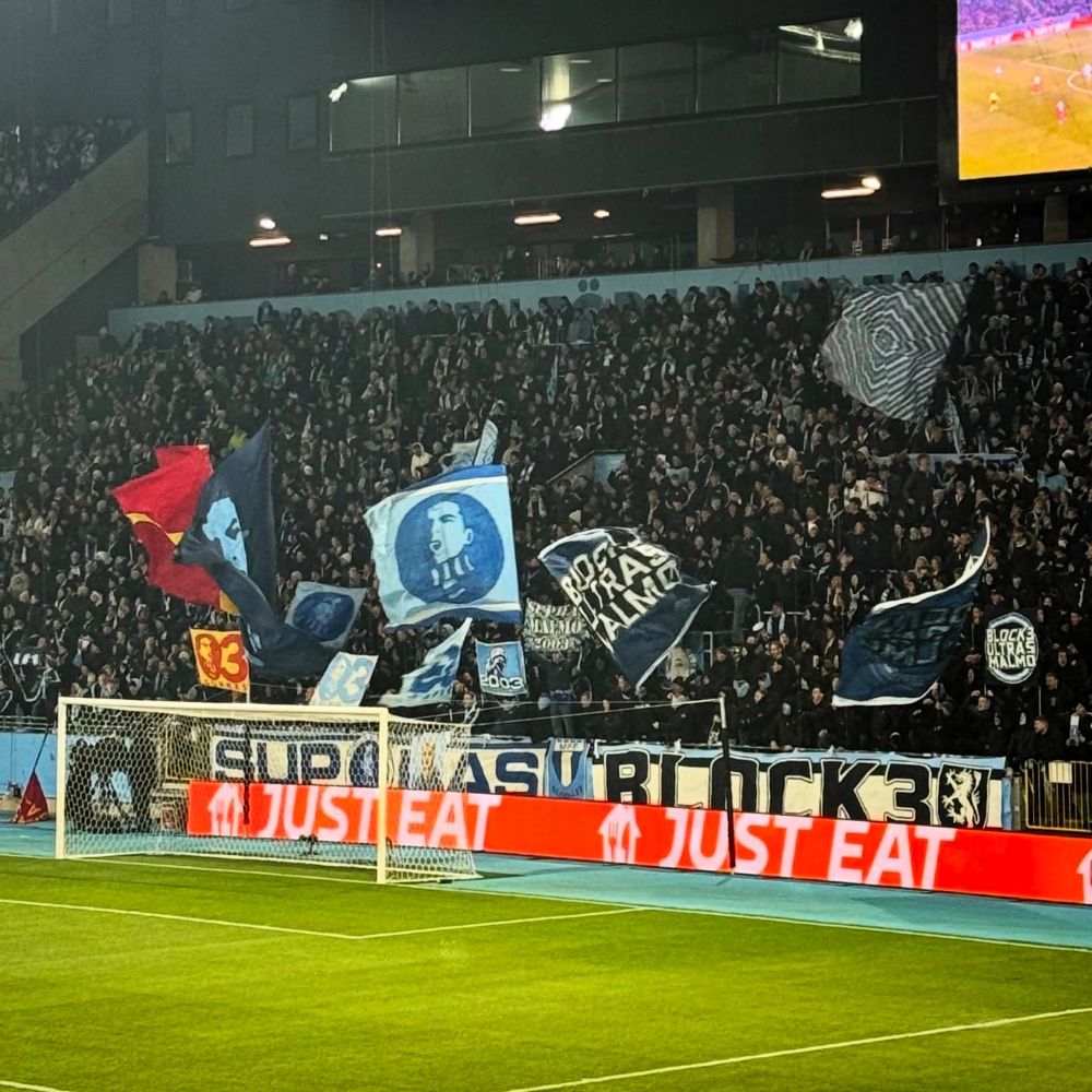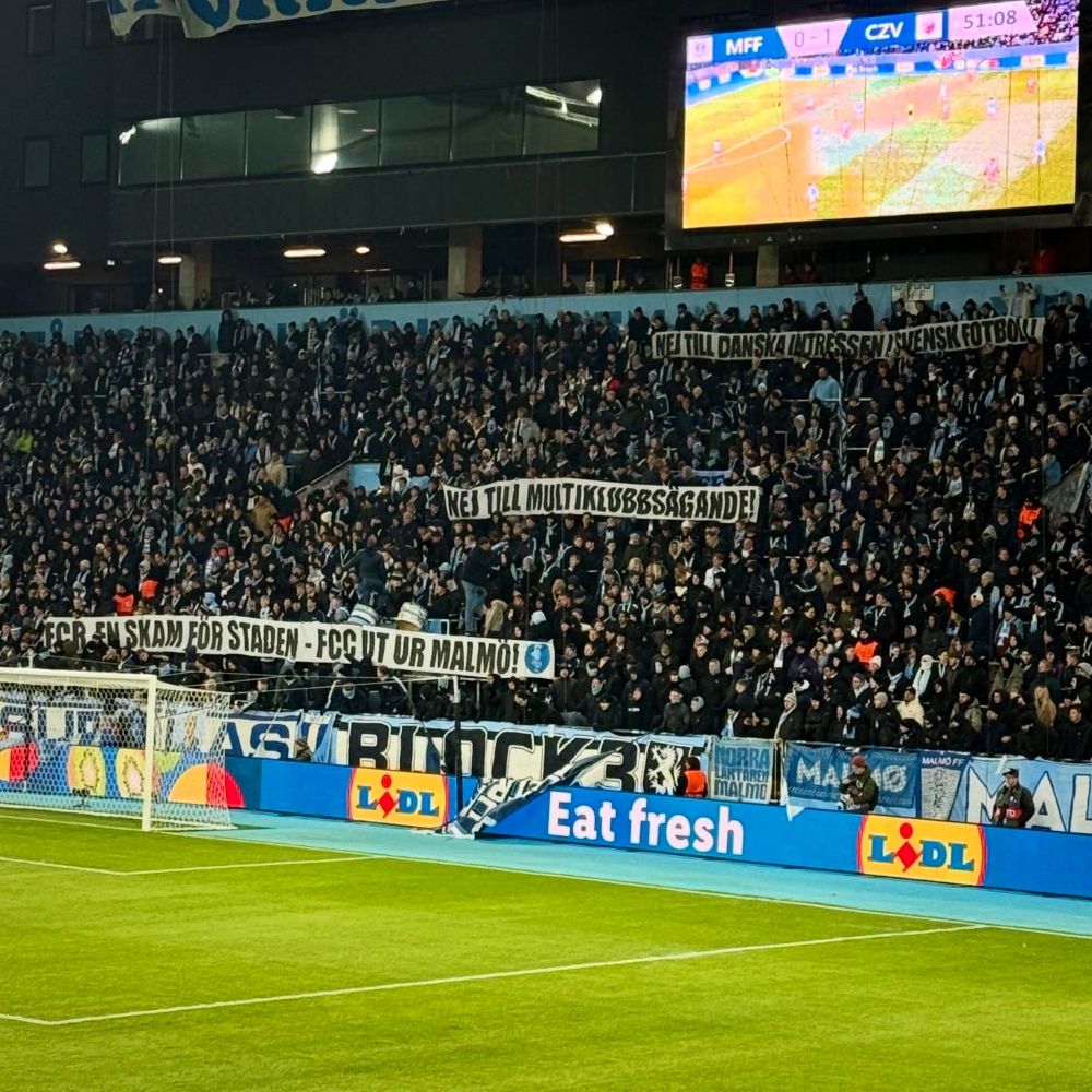 Die MFF-Fans dürften mit der Darbietung der Heimmannschaft zwar nicht zufrieden gewesen sein, verzichten jedoch auf verbalen Unmut. Stattdessen artikulierten sie zu Beginn der 2. Halbzeit ihr Missfallen über eine sportpolitische Entwicklung, die ihrem Club wahrscheinlich perspektivisch schaden wird. Die Szene zeigte auf drei Spruchbändern die Statements „Nej till danska intressen i svensk fotboll“ (Nein zu dänischen Interessen im schwedischen Fußball), „Nej till multiklubbsägande“ (Nein zu Mehrfachbesitz von Vereinen) und „FCR en skam för staden – FCC ut ur Malmö!“ (FCR ist eine Schande für die Stadt – FCK raus aus Malmö!). Dabei geht es um den geplanten Einstieg der dänischen Aktiengesellschaft Parken Sport & Entertainment, ihres Zeichens auch Eigentümer des FC København, beim Malmöer Drittligisten FC Rosengård 1917. Mehr dazu in den Fußnoten**.