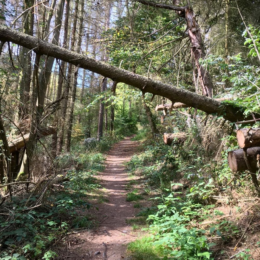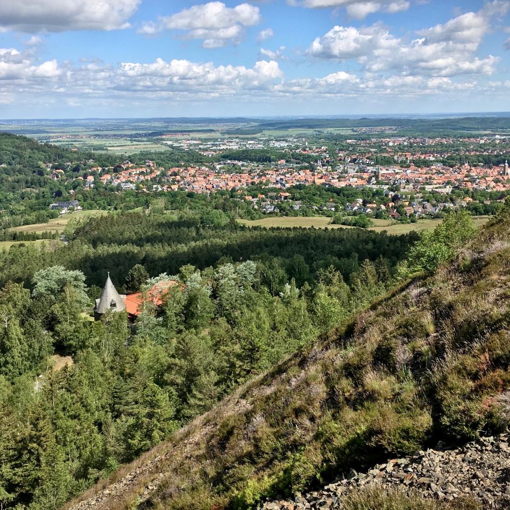 Meine erste Tour wurde analog auf der Karte geplant und weil alles schön nah beieinander lag, dachte ich, dass ich locker vier Stempel rund um Goslar schaffe. Es ging auch zunächst ganz entspannt vom Bahnhof zur Kaiserpfalz. Doch wenig später begann der Aufstieg zum Rammelsberg und zwischen Kilometer 2 und Kilometer 3,6 hatte meine Route 250 Höhenmeter auf einem wahrlich alpinen Trail (bis zu 30 % Steigung) zu bieten. Oben am Ramseck war ich also ziemlich im Eimer, aber dennoch glücklich den ersten Stempel im Buch zu haben und bei herrlichem Ausblick kurz durchzuatmen.