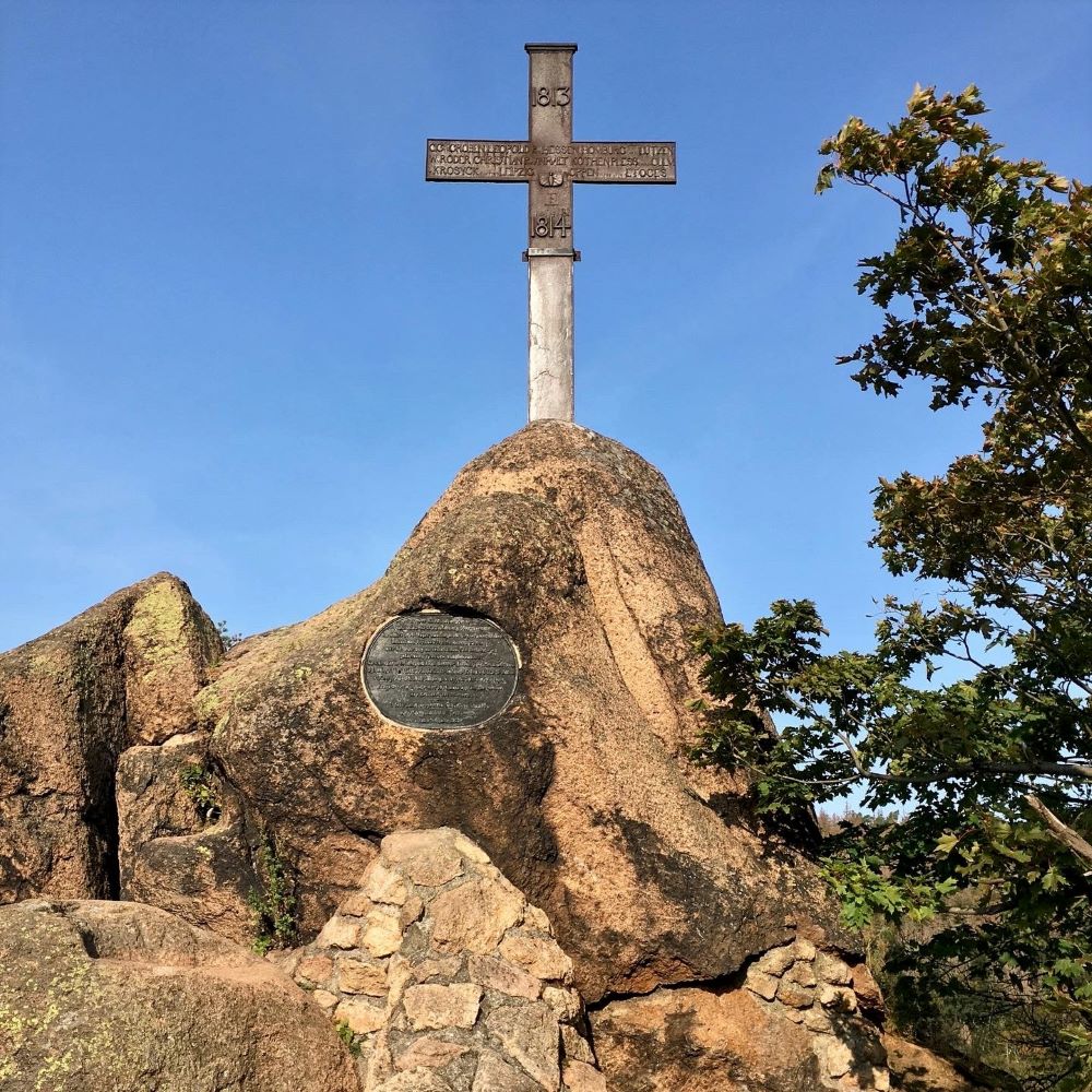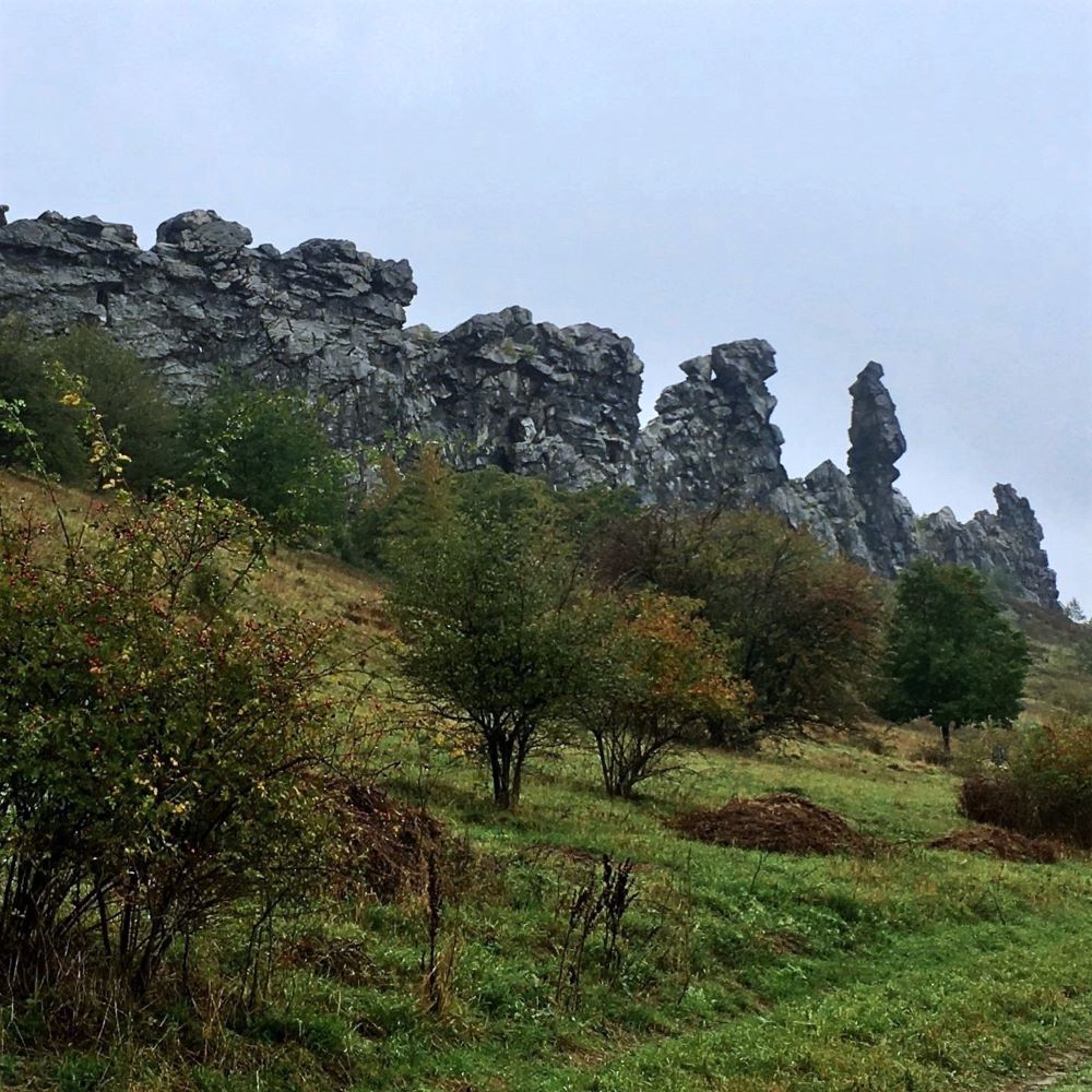 Am 17. Oktober startete ich um 10 Uhr in Thale eine Wanderung nach Neinstedt. Leider meine erste Mistwettertour auf dem Weg zum Harzer Wanderkaiser. Aber es gibt bekanntlich kein schlechtes Wetter, sondern nur schlechte Kleidung (5 € ins Phrasenschwein…). Die erste Stempelstelle des Tages war der ca. 3,5 km vom Bahnhof entfernte Glockenstein (506 m ü. NN). Dabei handelt es sich um einen glockenförmigen Granitblock, der in der Sagenwelt des Harzes während der Walpurgisnacht mit seinem Geläut den Hexen den Weg zum Brocken weist.