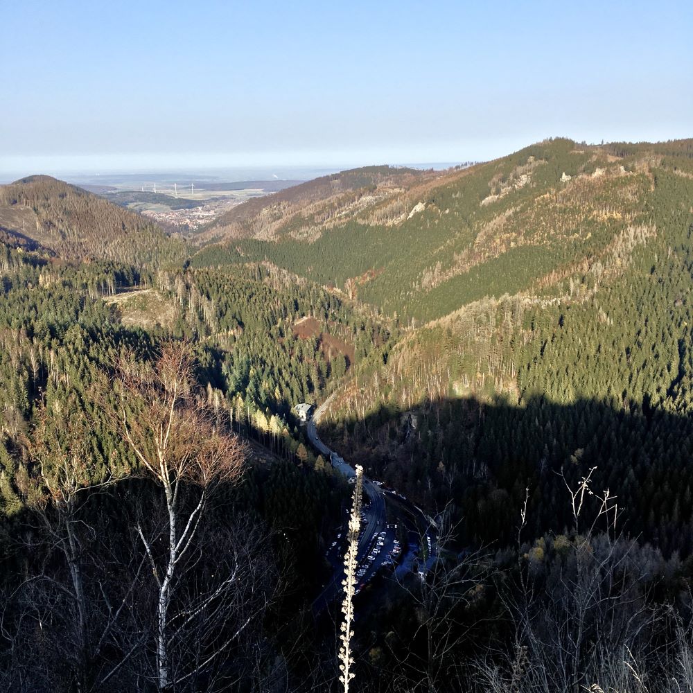 Anstatt auf dem Naturmythenpfad unsere innere Mitte zu suchen, wollten wir jedoch lieber die 2,8 km entfernten Hahnenkleeklippen erkunden. Die liegen auf 758 m ü. NN zwischen Braunlage und St. Andreasberg, hoch über dem Odertal thronend. Von den Klippen hat man eine herrliche Aussicht auf den Rehberg und den künstlich angelegten Rehberger Graben. Unten im Tal schlängelt sich derweil die Oder gen Süden.