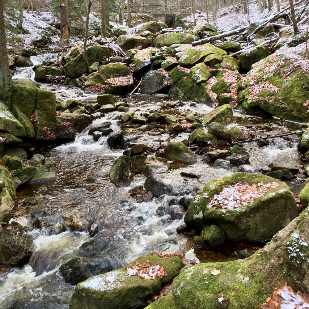 Am 2. Weihnachtsfeiertag machte ich eine weitere Tour durch das Ilsetal. Diesmal zusammen mit Kim, Ole und Max. Nachdem im September die Stempelstellen östlich der Ilse abgewandert wurden, waren nun die Exemplare westlich des Flusses fällig. Doch zunächst marschierten wir den romantischen Heinrich-Heine-Weg an der Ilse entlang. Dabei kam es meinerseits zu einem Revisit der Stempelstelle Bremer Hütte.