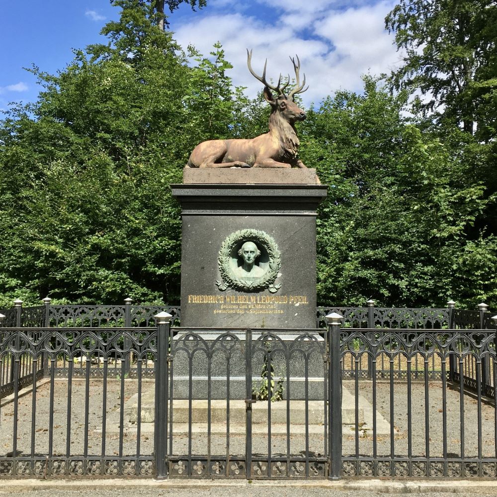 Zum Glück mussten zum fünften Stempel des Tages nur weitere 2,2 km bei moderater Steigung gemeistert werden. Auf Tourkilometer 14,5 erreichten wir das Pfeil-Denkmal auf 470 m ü. NN. Gewidmet ist es dem mir bisher unbekannten Friedrich Wilhelm Leopold Pfeil (* 1783; † 1853), der sich zu Lebzeiten als Forstwissenschaftler und Schriftsteller offenbar denkwürdig ausgezeichnet hatte.