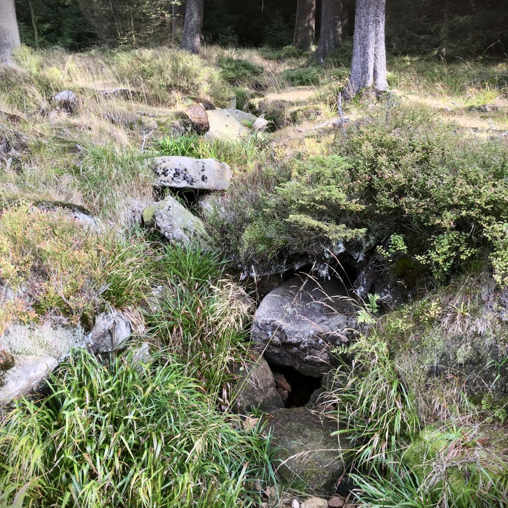Der dritte und letzte Stempel des Tages wurde nur 1.000 Meter entfernt vom Dreieckigen Pfahl am Eckersprung eingesackt. Hier befindet sich die Quelle der Ecker. Einem der zahlreichen Flüsse, die ihr Quellgebiet am Fuße des Brocken haben. Ferner kreuzt auch der beliebte Goetheweg von Torfhaus auf den Brocken den Eckersprung. Ein kurzes Stück mussten wir auch auf dem hochfrequentierten Goetheweg wandern, ehe wir nach 2 km auf den Kaiserweg abzweigten und vorbei an den Hopfensäcken nach Oderbrück zurückkehrten. Waren am Ende 12,2 km und 250 Höhenmeter in 3:30 h.