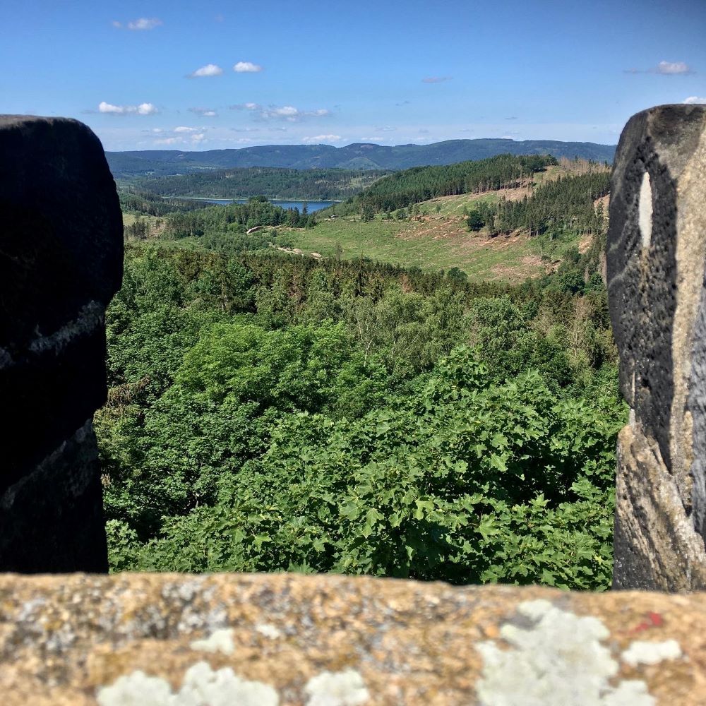 Über eine Alm und durch das Eckertal wurden die nächsten 3,1 km und 100 Höhenmeter gemeistert. Auf der Staumauer der Eckertalsperre, über welche bis 1989 auch die innerdeutsche Grenze verlief, erwartete uns der Stempelkasten mit der Nr. 001. Sicher ist die Durchnummerierung der Stempelkästen wertfrei erfolgt, aber hier bietet sich nichtsdestotrotz eines der tollsten Panoramen im Harz. Am Ostufer der Talsperre ging es nun weiter zur Rangerstation am Scharfenstein, welche wir mit bisher 380 Höhenmetern in den Beinen auf Tourkilometer 8,3 erreichten.