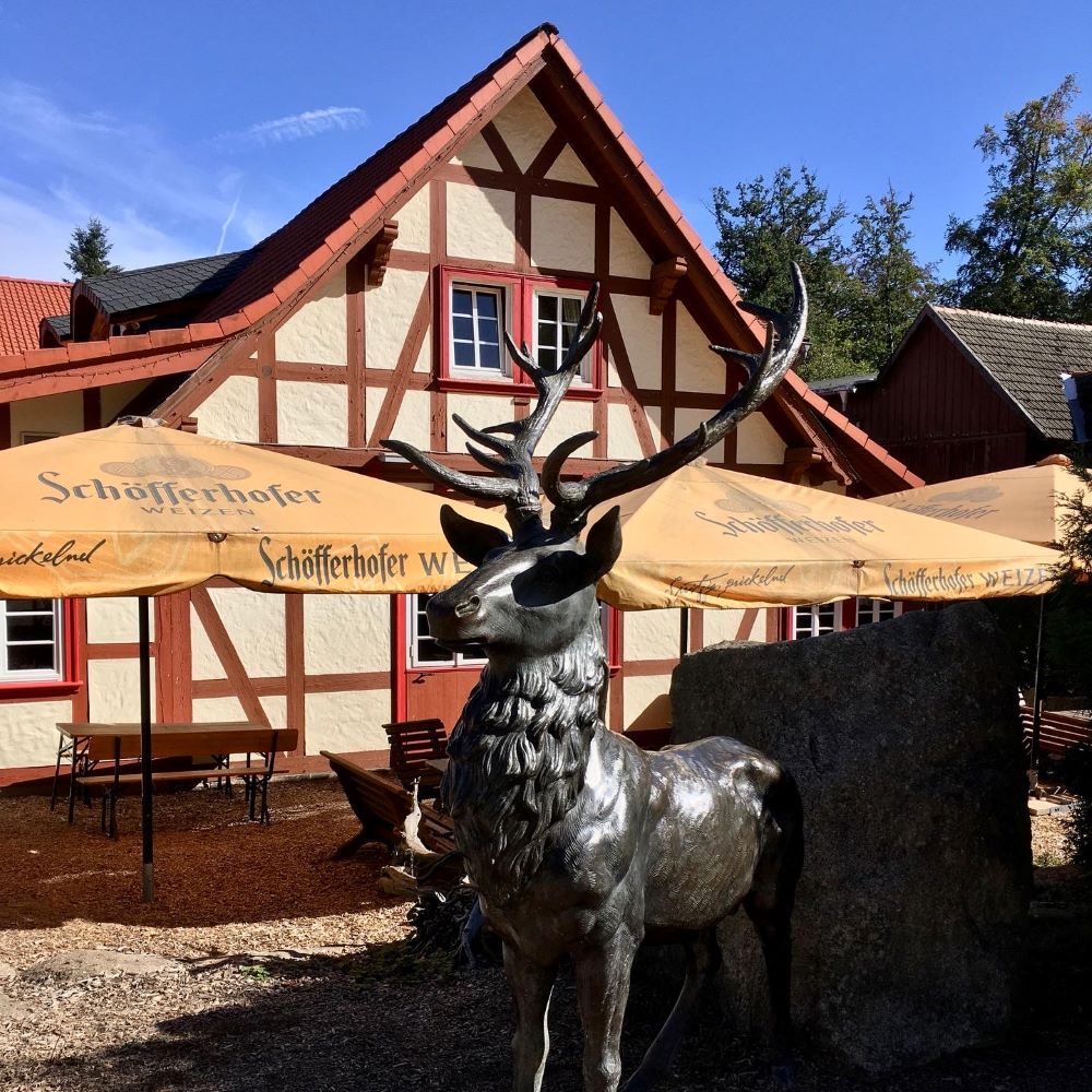 Das nächste Etappenziel war das Forsthaus bzw. Gasthaus Todtenrode auf Tourkilometer 11,1 und 420 m ü. NN. Ein schönes historisches Forsthaus, teilweise mit Holz verkleidet und mit kunstvoll geschnitzten Figuren versehen, welches heuer ein beliebtes Ausflugslokal beheimatet. War einladend und so gönnten wir uns hier nach dem Stempeln eine größere Pause mit Speis und Trank.