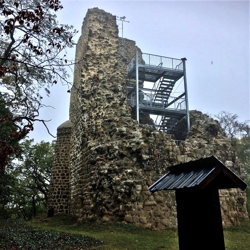 Nächstes Etappenziel war die Ruine der Lauenburg. Vom Glockenstein ging es nun über den steinigen Bergmannsstieg recht steil hinab ins Wurmbachtal. Nach Querung des Wurmbachs ging es wieder bergauf und gegen 11 Uhr erreichte ich auf Wanderkilometer 5,9 die Überreste der Lauenburg. Die Burg aus dem 11. Jahrhundert war dereinst über 350 Meter lang und diente zum Schutz des nahen Stiftes Quedlinburg. Von der Turmruine der Vorburg hat man bei entsprechenden Sichtverhältnissen einen tollen Ausblick auf die Teufelsmauer und Quedlinburg. Hatte ich heute also leider Pech.