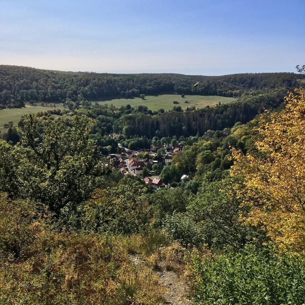 Als nächstes steuerten wir den Aussichtspunkt Schöneburg an. Der befand sich mitsamt Stempelkasten auf unserem Wanderkilometer 5,9 in 441 m ü. NN und bot einen fantastischen Ausblick auf den Ort Altenbrak im Bodetal. Anschließend arbeiteten wir uns über einen netten Trail ins Tal hinunter.