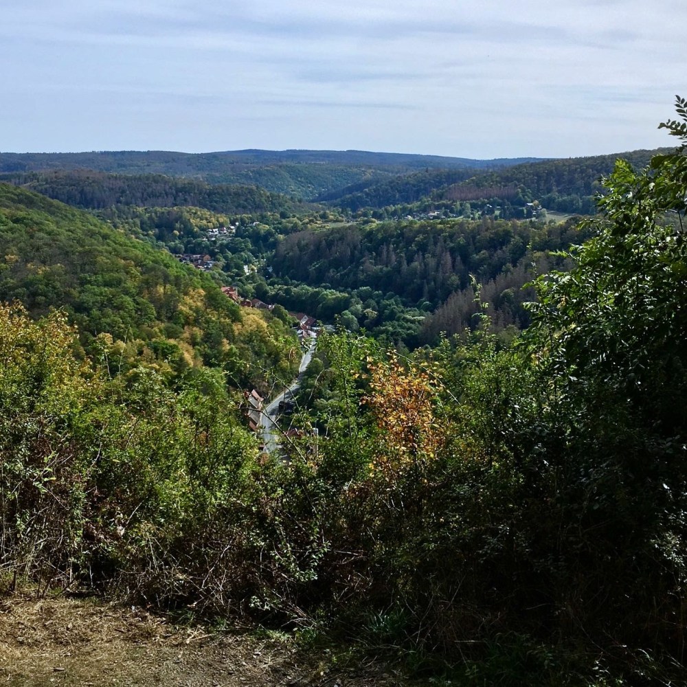 In Treseburg hätte es nun optional motorisiert zurück zur Rosstrappe gehen können. Aber nach 11,2 km war noch Kraft in den Beinen, so dass Bergers Plan B griff. Nämlich zu Fuß auf einer anderen Route zurück nach Thale und dabei noch vier weitere Stempel zu sammeln. Frau Berger, Mama Berger und Herr Snepanović willigten ein. Wenn man schon mal hier ist… Der nächste Stempel war außerdem nur ca. 1 km entfernt. Leider mussten auf den 1.000 Metern aber auch 130 Höhenmeter gemeistert werden und oben am Aussichtspunkt Weißer Hirsch war ich erstmal im Eimer.