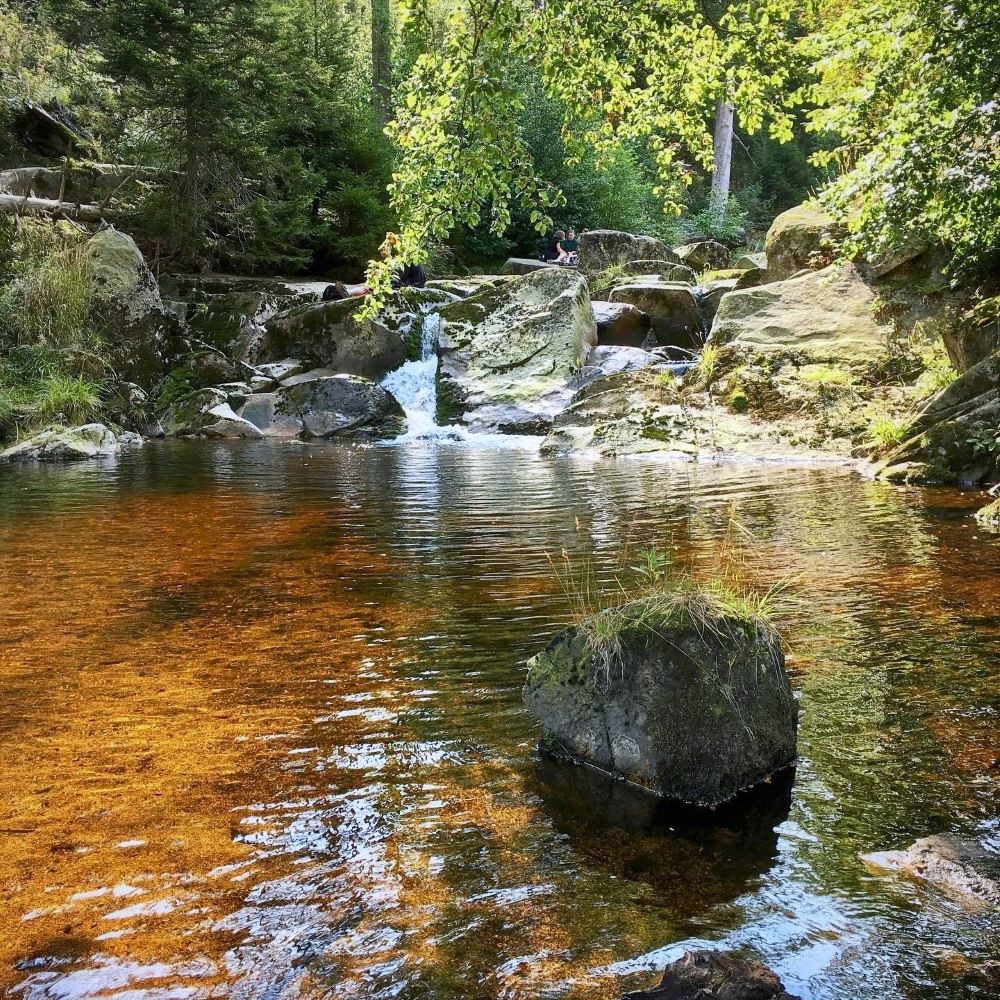 Von Altenau wanderten wir nun ein gutes Stück den Dammgraben entlang. Der Dammgraben ist mit ca. 19 km der längste künstliche Wasserlauf des Harzes und versorgte früher die Bergwerke mit Wasser aus den niederschlagsreichen Höhenlagen. Er gehört zum Oberharzer Wasserregal, welches als weltweit bedeutendstes vorindustrielles Wasserwirtschaftssystem des Bergbaus seinen Eintrag im UNESCO Welterbe gefunden hat. Auf unserem Teilstück befanden sich nun zwei Stempelstellen. Die erste war eine Rastgelegenheit namens Kleine Oker.