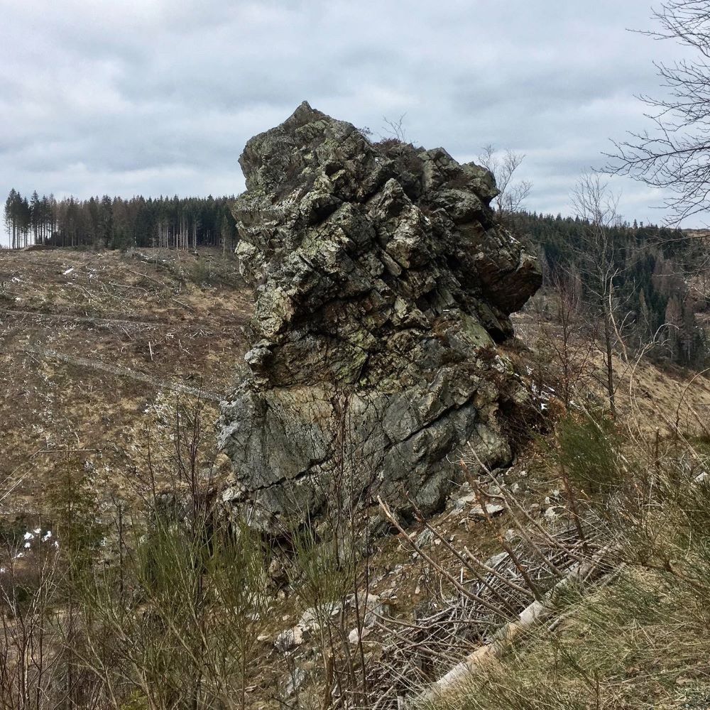 Bei den Touren der letzten Monate blieben zwischen dem Oderteich und Bad Harzburg drei Stempel liegen, weil jeweils die Einbindung in die Wanderrouten nicht passte. Mit etwas unkonventioneller Streckenführung sollten die Lücken heute an einem Tag geschlossen werden. Abto, Ole und ich starteten in Torfhaus und marschierten zunächst zur Jungfernklippe (660 m ü. NN), die eigentlich bei der letztjährigen Tour zwischen Torfhaus und Altenau mit auf der Liste stand, aber aufgrund eines gesperrten Weges ausgelassen wurde. Nun wurde der Stempel auf Kilometer 2,7 der heutigen Tour verbucht.