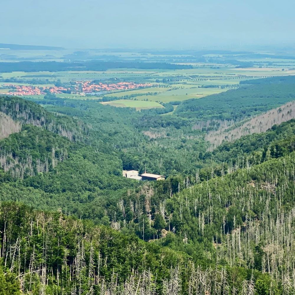 Gut gestärkt ging es zunächst von der Walzenhütte hinunter ins feuchte Dammbachtal und dann hinauf zur Carlshaushöhe (626 m ü. NN), wo uns auf dem elften Kilometer der Tour der vierte Stempel am Carlsturm erwartete. Jener 50 m hohe Funkturm mit Besucherplattform wurde 1998 von der Harzer Schmalspurbahn GmbH errichtet und bietet eine tolle Fernsicht. Oder anders gesagt; dort oben wird einem das Ausmaß der gegenwärtigen Harzer Naturkatastrophe nochmal besonders deutlich.