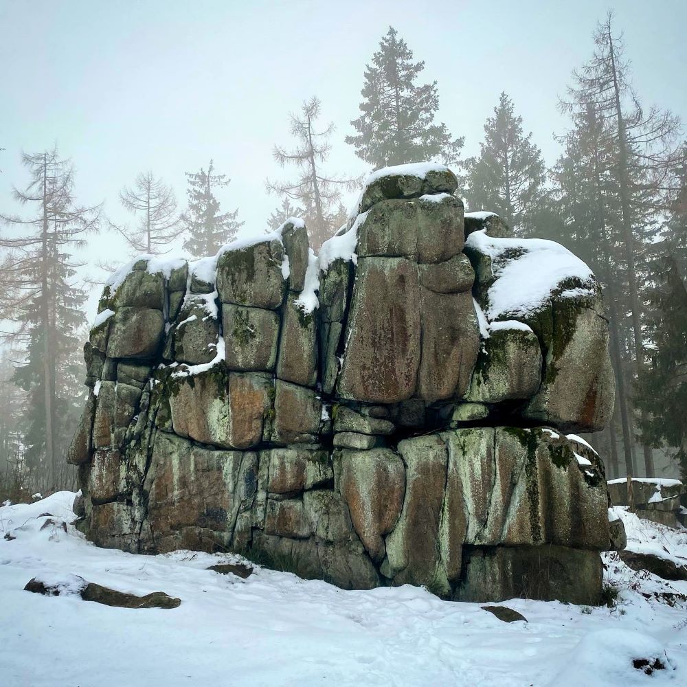 Nur 1,5 km vom Bergrat-Müller-Teich entfernt, konnte auf dem Gipfel des Rambergs (581 m ü. NN) sogleich der nächste und mein insgesamt 144.Stempel eingesackt werden. Der Stempelkasten befindet sich hier an der markanten Granitfelsformation namens Große Teufelsmühle. Der Granit hat dort durch chemische und physikalische Prozesse die für den Harz typische Wollsackverwitterung erfahren, wobei die Gesteinsblöcke nun an aufeinander gestapelte Kissen oder Wollsäcke erinnern.
